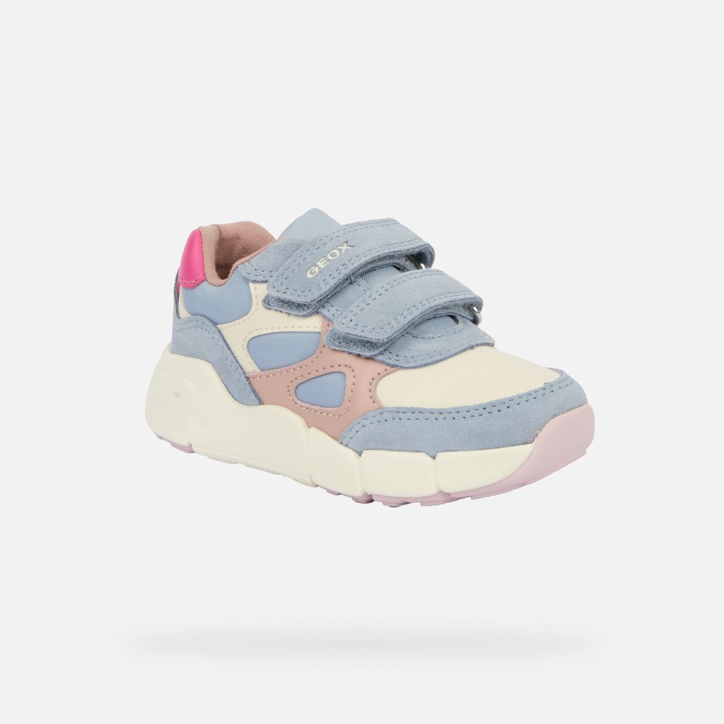 Světle modré dívčí tenisky Geox Flexyper Mini se suchými zipy pro rychlé nazouvání bez zavazování.