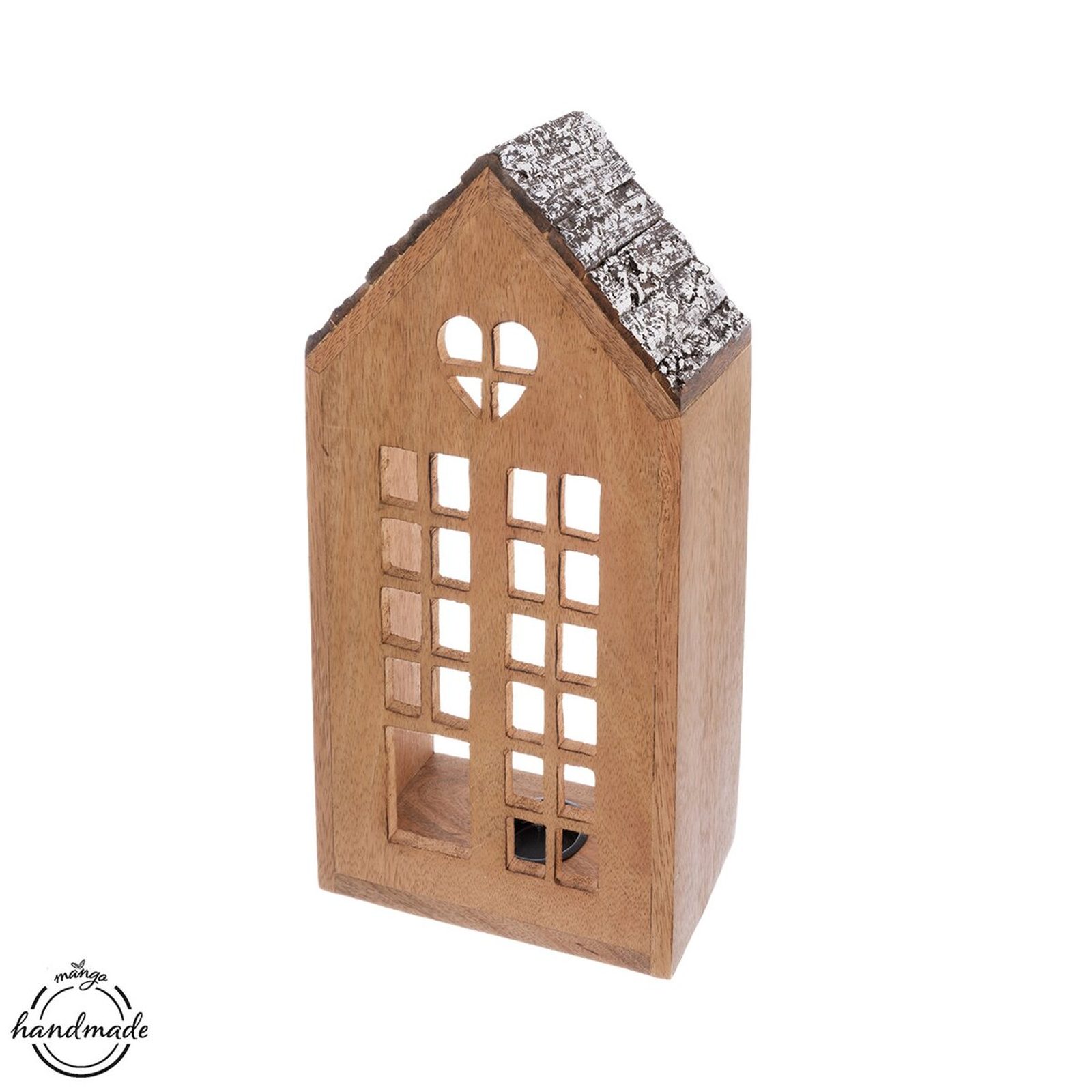 Svícen z mangového dřeva ve tvaru domečku bude krásným a stylovým prvkem interiéru během celého roku. Jeho přírodní materiál a originální design v podobě domečku dodají prostoru útulnou atmosféru. Uprostřed svícnu se nachází stojánek určený pro čajovou svíčku. V případě jejího použití však nenechávejte svícen bez dozoru a vždy dohlédněte na to, aby plamen nesahal příliš vysoko. Pro větší bezpečnost můžete místo klasické svíčky použít i bezpečnou variantu v podobě LED svíčky. Skvěle poslouží jako vkusný a nápaditý dárek. Materiál: mangové dřevo, kov. Rozměry: 14x8,5x28,5 cm.