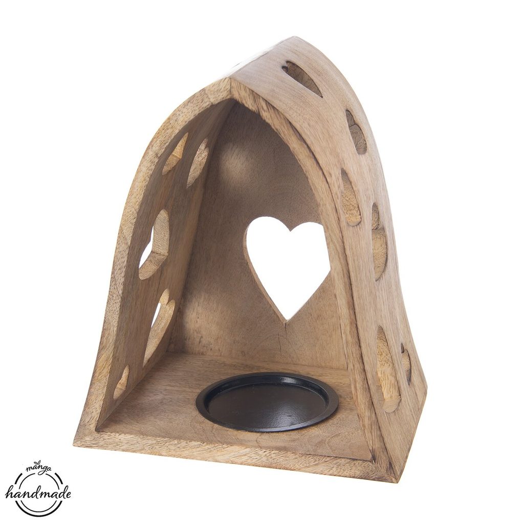 Svícen se srdíčky ozdobí vaši domácnost. Zapálená svíčka uvnitř svícnu prosvětlí otvory ve tvaru srdíček a ty se pak promítají na stěnu nebo na strop… Vhodný také jako dárek. Uvnitř je stojánek na čajovou svíčku, je umístěn ve vyfrézovaném otvoru v rámu tak, aby svíčka držela na místě a neposunovala se. Materiál: dekorativní mangové dřevo, kov. Rozměry: 20x14x23,2 cm.