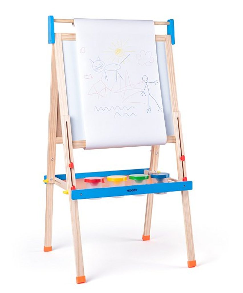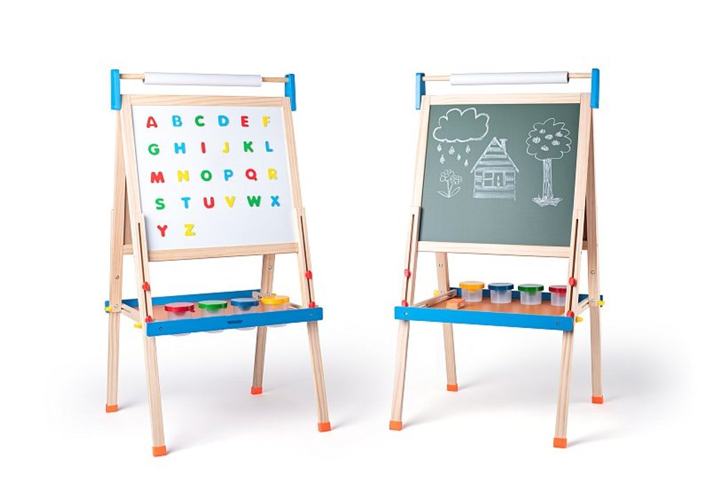 Z jedné strany je zelená plocha pro psaní křídami, z druhé bílá magnetická plocha pro psaní fixou. Nad tabulí je do konstrukce zabudovaná tyčka pro upevnění role papíru, který lze odvíjet a malovat na ploše, kterou poskytují desky tabulí. Obsahuje magnetická písmena, bílé křídy, fix, houbičku a kelímky na vodu a barvy.