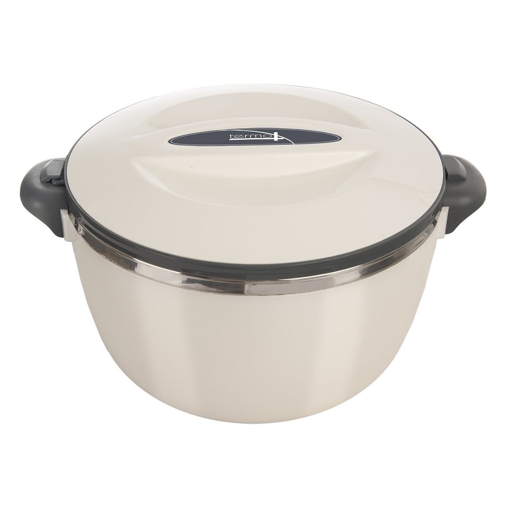 Termomísa v plastovém obalu s nerezovým vnitřkem udrží vložený pokrm po dlouhou dobu teplý nebo naopak chladný. Snadné uzavření otočením plastového termo víčka. Využijete ji v domácnosti, zaměstnání i na cestách, v létě i zimě. Skvělé izolační vlastnosti. Je lehká, snadno přenosná. Hladký povrch je snadno omyvatelný. Výborné využití v horkých letních dnech na zmrzlinu. Délka udržení teploty v nádobě závisí na okolní teplotě, resp. teplotním rozdílu vnější teploty a teploty uvnitř nádoby. Před vložením studeného pokrmu, např. zmrzliny, vložte nádobu cca na hodinu do ledničky, prodloužíte tím chladící efekt. Při vkládání teplého jídla nalijte dovnitř horkou vodu, kterou zhruba po 1-2 minutách vylijte. Materiál: nerez, plast PP. Rozměry: pr. 24 cm, v. 16 cm, š. s uchy 31 cm, užitný objem 3,5 l, celkový objem 3,9 l. Není vhodná do myčky.