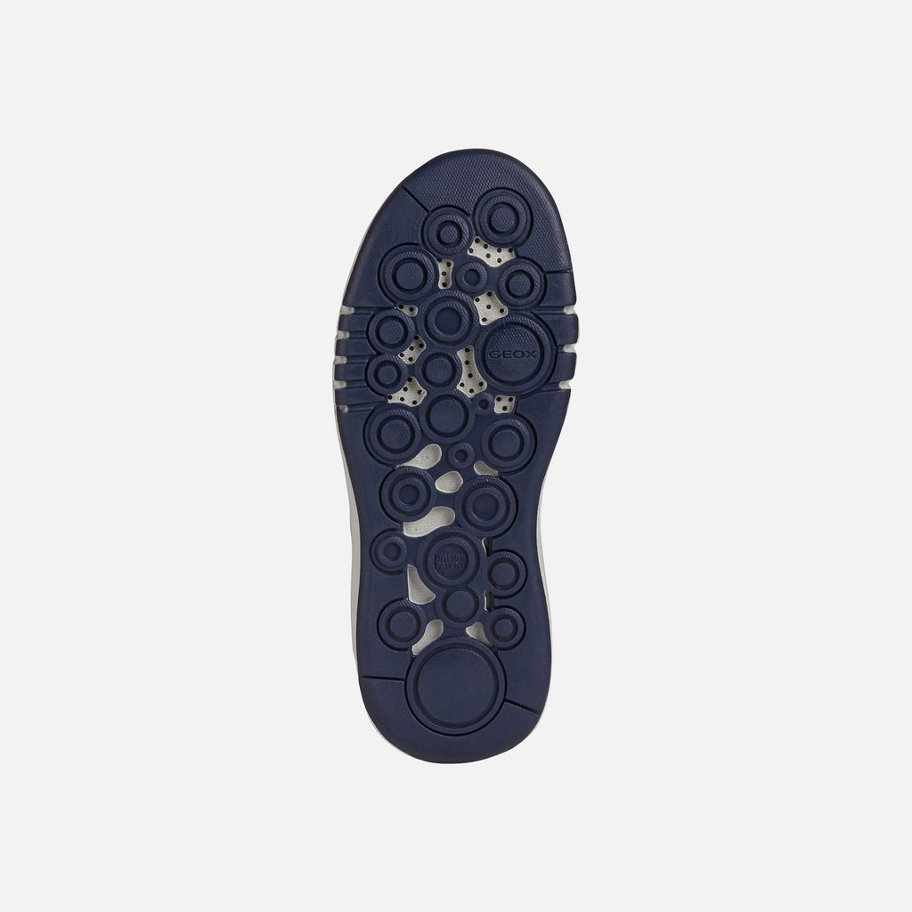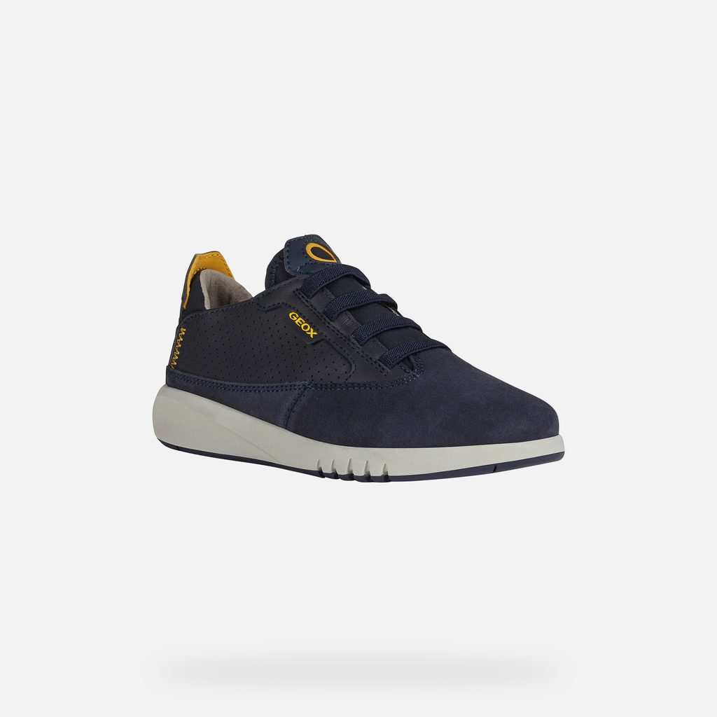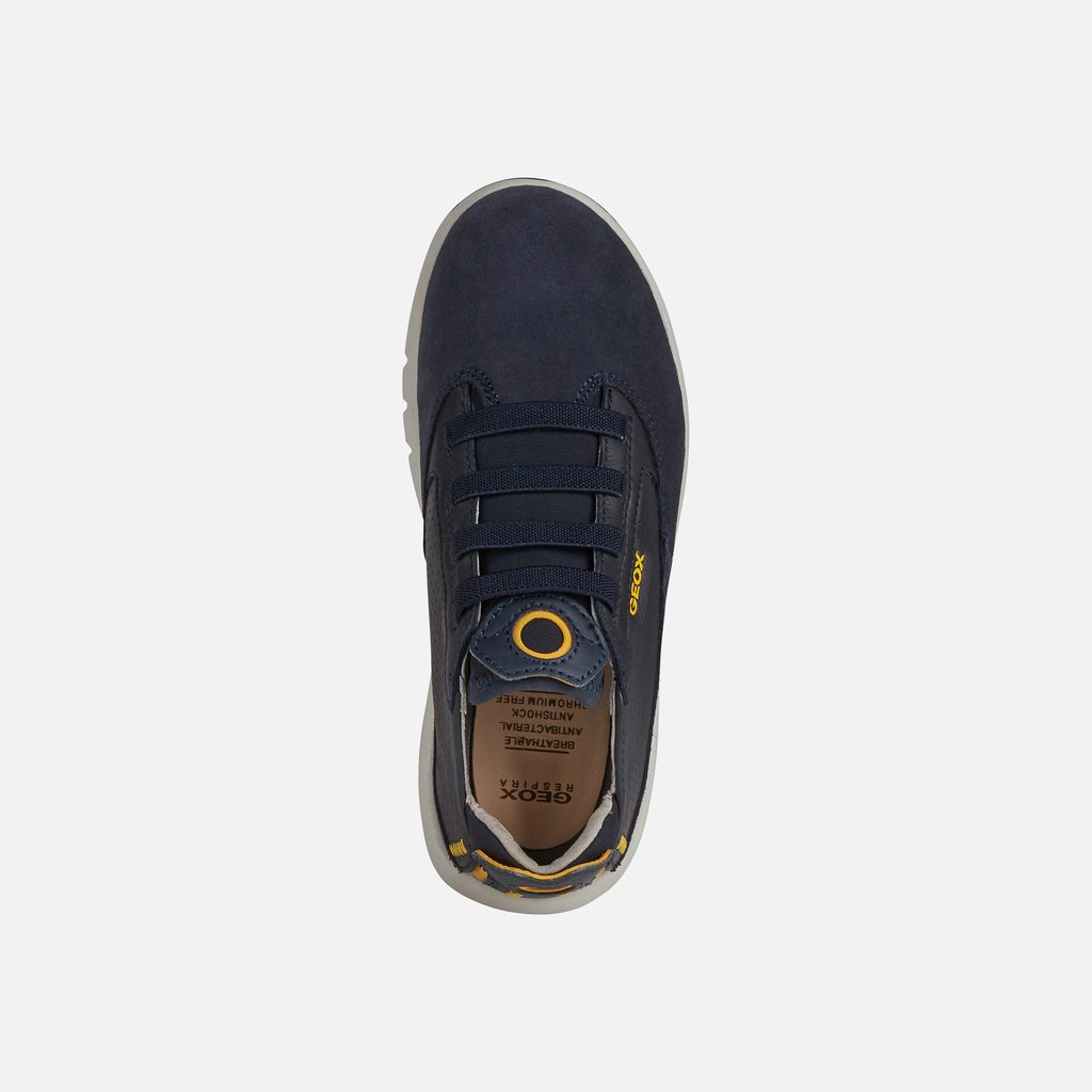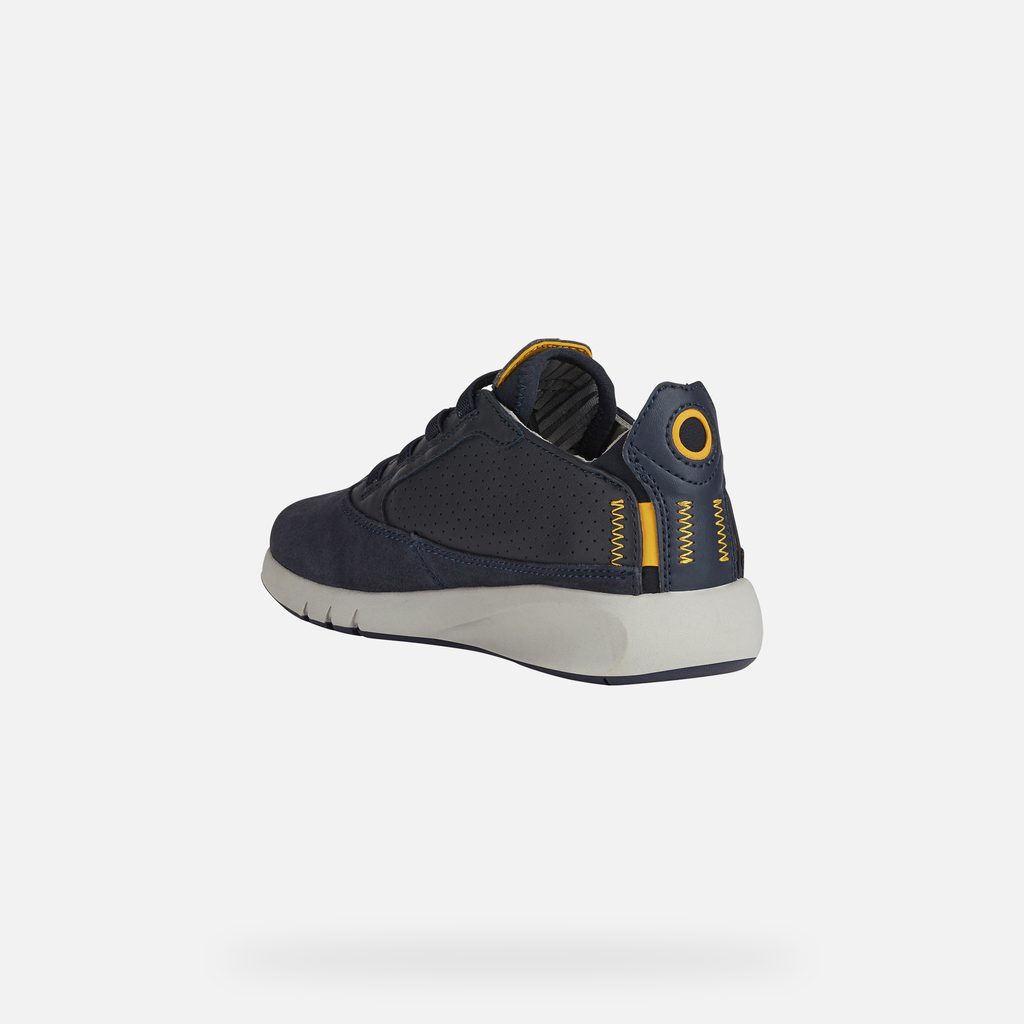 Tmavě modré chlapecké tenisky Geox Aeranter vynikají moderním designem s perforovaným svrškem a žlutými detaily. Výrazný branding GEOX na boku a zadní části obuvi dodává teniskám sportovní charakter, zatímco čistá bílá podrážka zajišťuje elegantní kontrast.