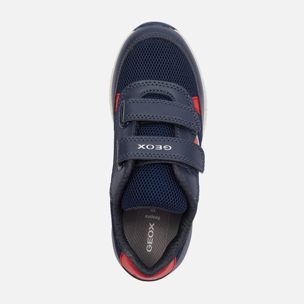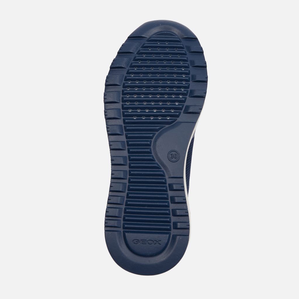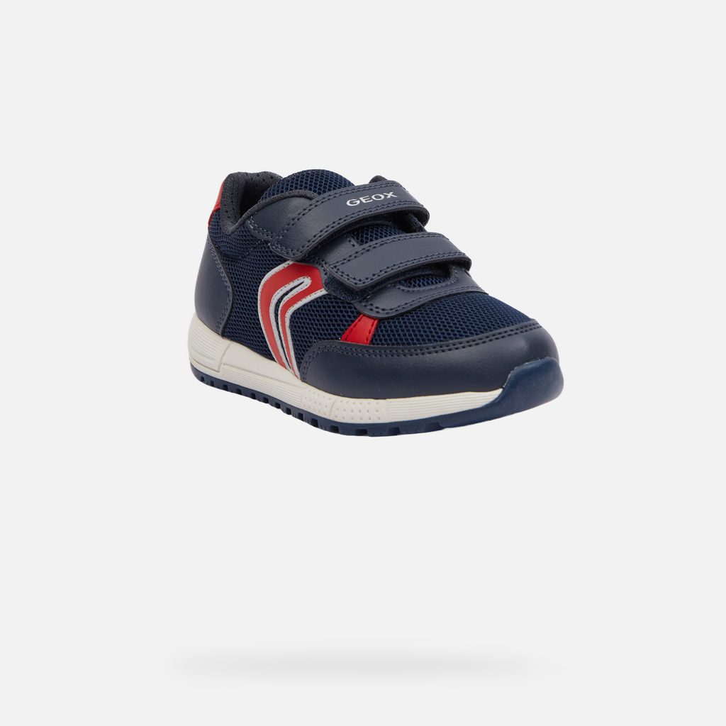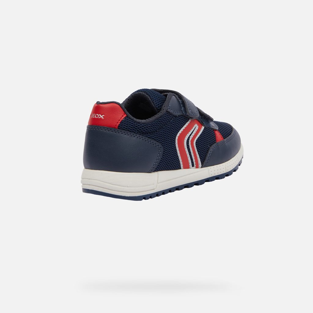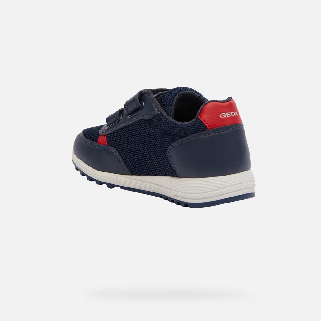 Stylové chlapecké tenisky Geox Alben v tmavě modrém provedení s červenými a bílými akcenty zaujmou sportovním designem. Výrazný pruhovaný vzor na boku a prodyšný síťovaný svršek dodávají botám moderní vzhled, zatímco praktický systém zapínání na dva suché zipy zajišťuje snadné obouvání.