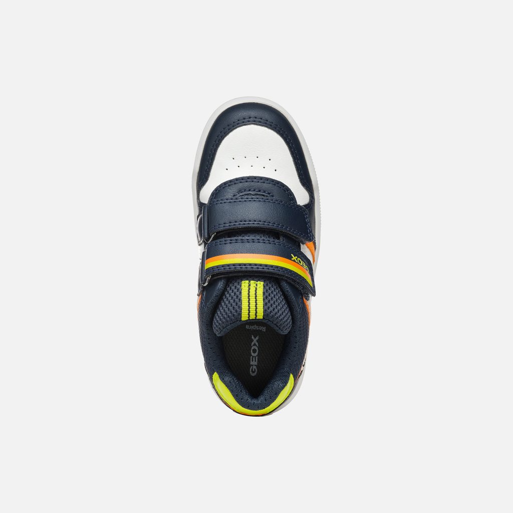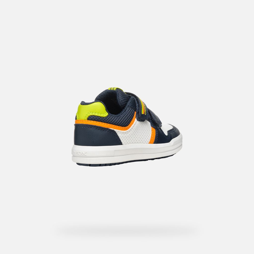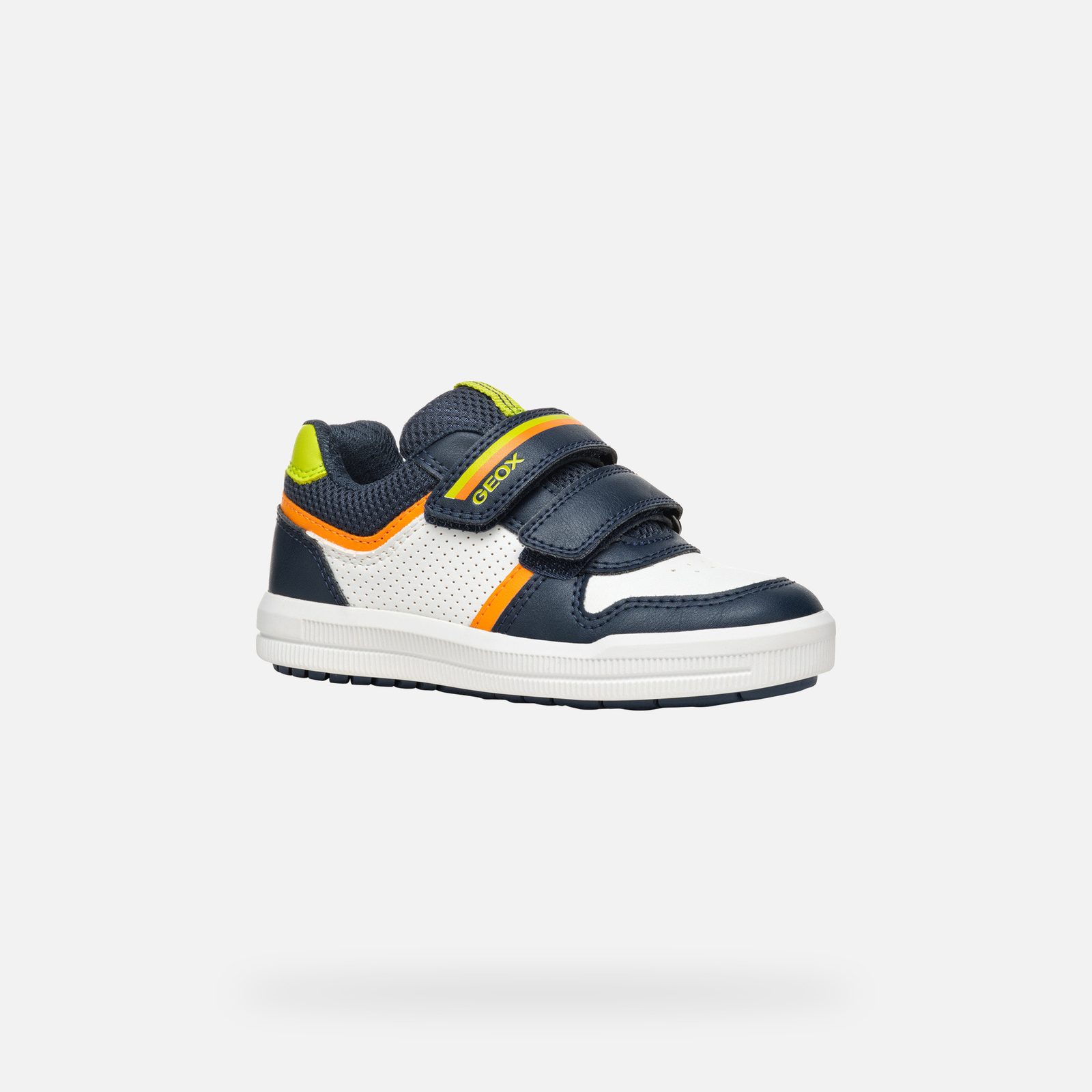 Chlapecké tenisky Geox Arzach v tmavě modré barvě zaujmou svým sportovním designem. Bílý svršek doplňují tmavě modré překryvy, neonově zelené akcenty na patě a límci, a výrazný oranžový pruh na boku. Praktické zapínání na dva suché zipy, z nichž horní nese neonově zelený nápis GEOX, zajišťuje snadné obouvání.