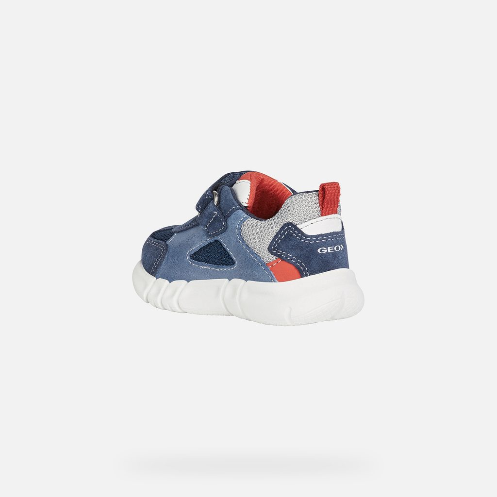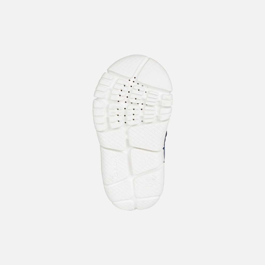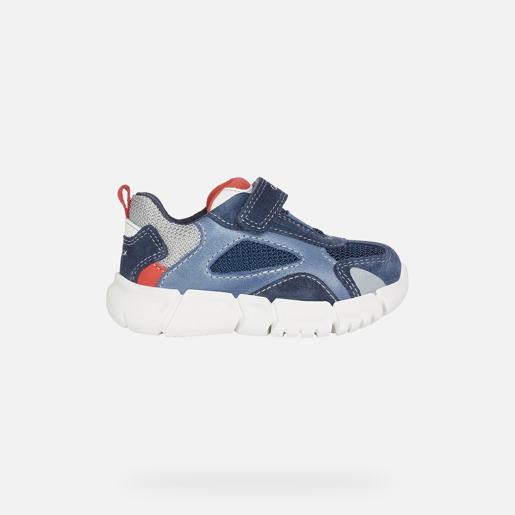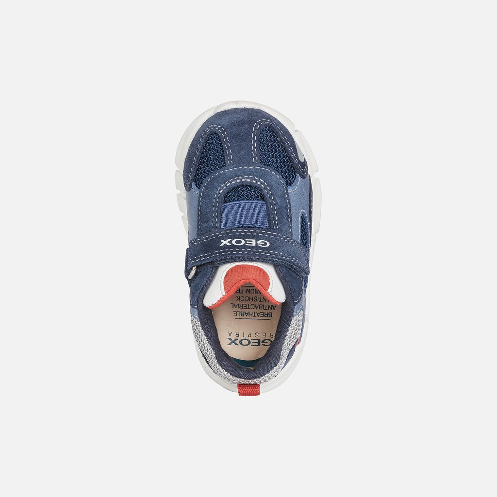 Stylové chlapecké tenisky Geox Flexyper v tmavě modrém provedení zaujmou moderním designem s červenými a světle modrými detaily. Praktický suchý zip zajišťuje snadné obouvání, zatímco červené poutko na patě usnadňuje manipulaci.