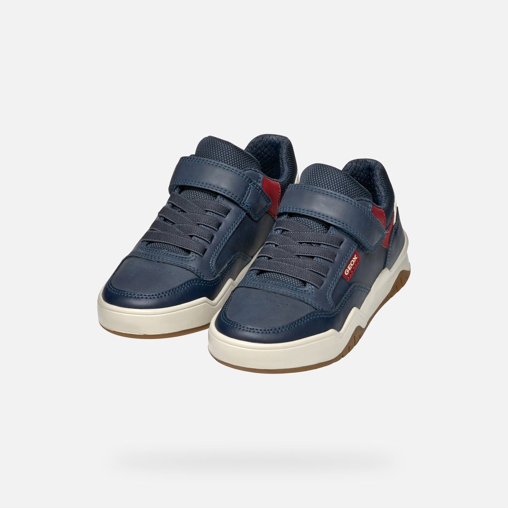 Tmavě modré chlapecké tenisky Geox Perth s praktickým suchým zipem a červenými akcenty.