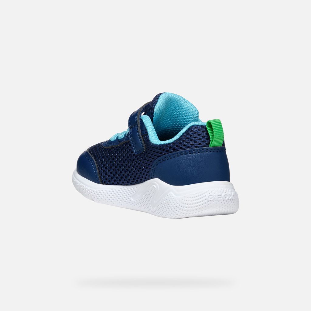 Tmavě modré chlapecké tenisky Geox Sprintye zaujmou moderním designem s výrazným zeleným zigzag vzorem na boku a světle modrými tkaničkami. Bílá podrážka zajišťuje výbornou přilnavost na různých površích.
