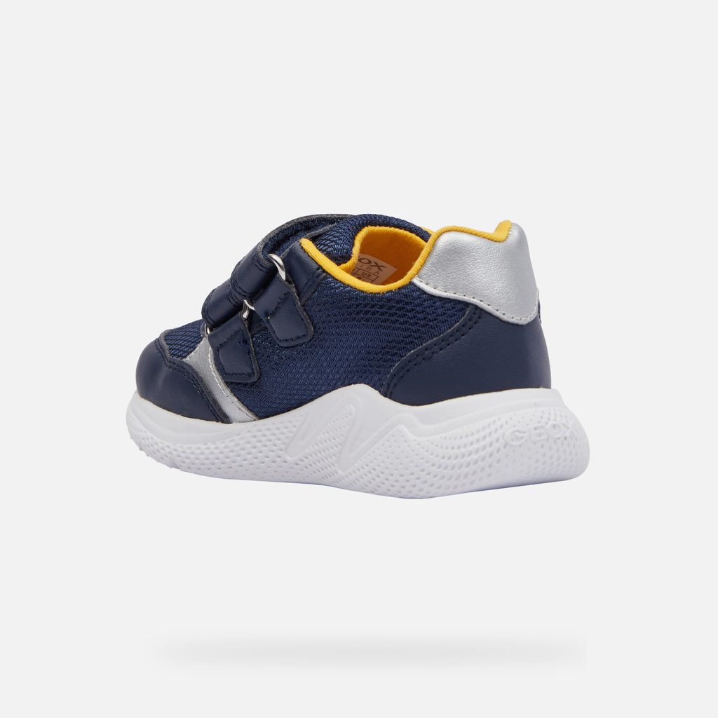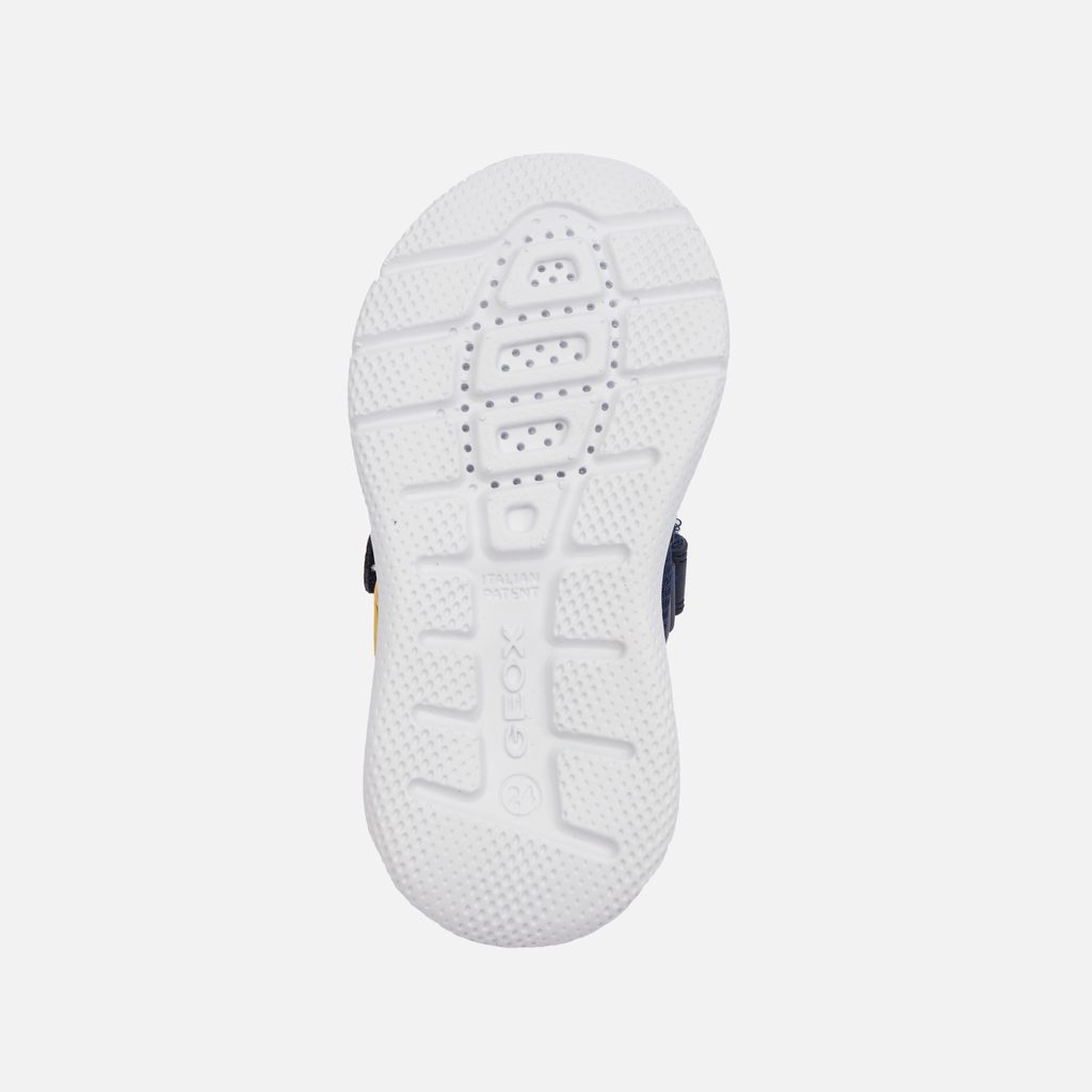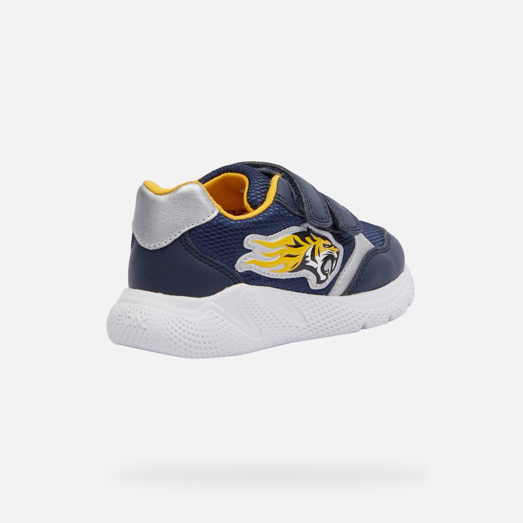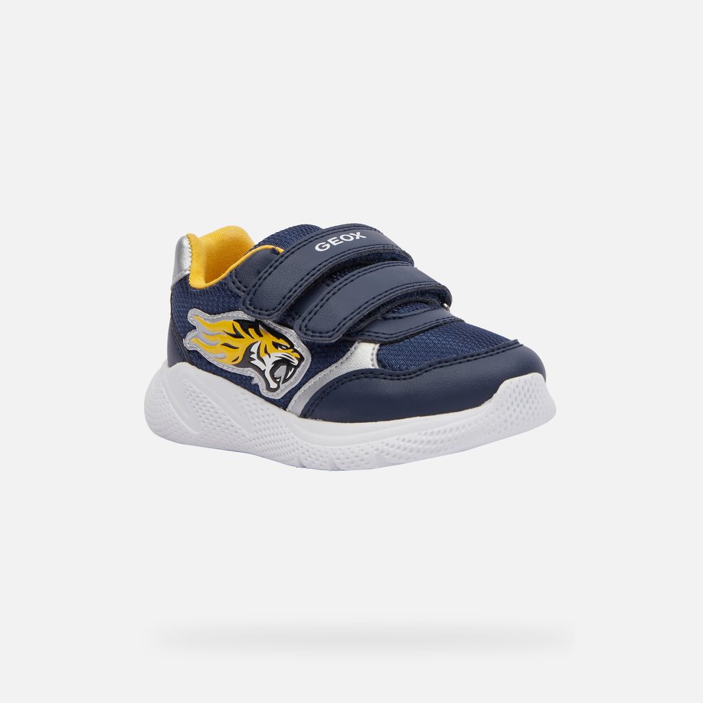 Tmavě modré chlapecké tenisky Geox Sprintye zaujmou stylovým designem s výrazným žlutým a černým motivem tygří hlavy na boku. Pohodlné zapínání je řešeno dvěma tmavě modrými pásky na suchý zip, vnitřní část boty je doplněna žlutým polstrováním pro větší komfort.