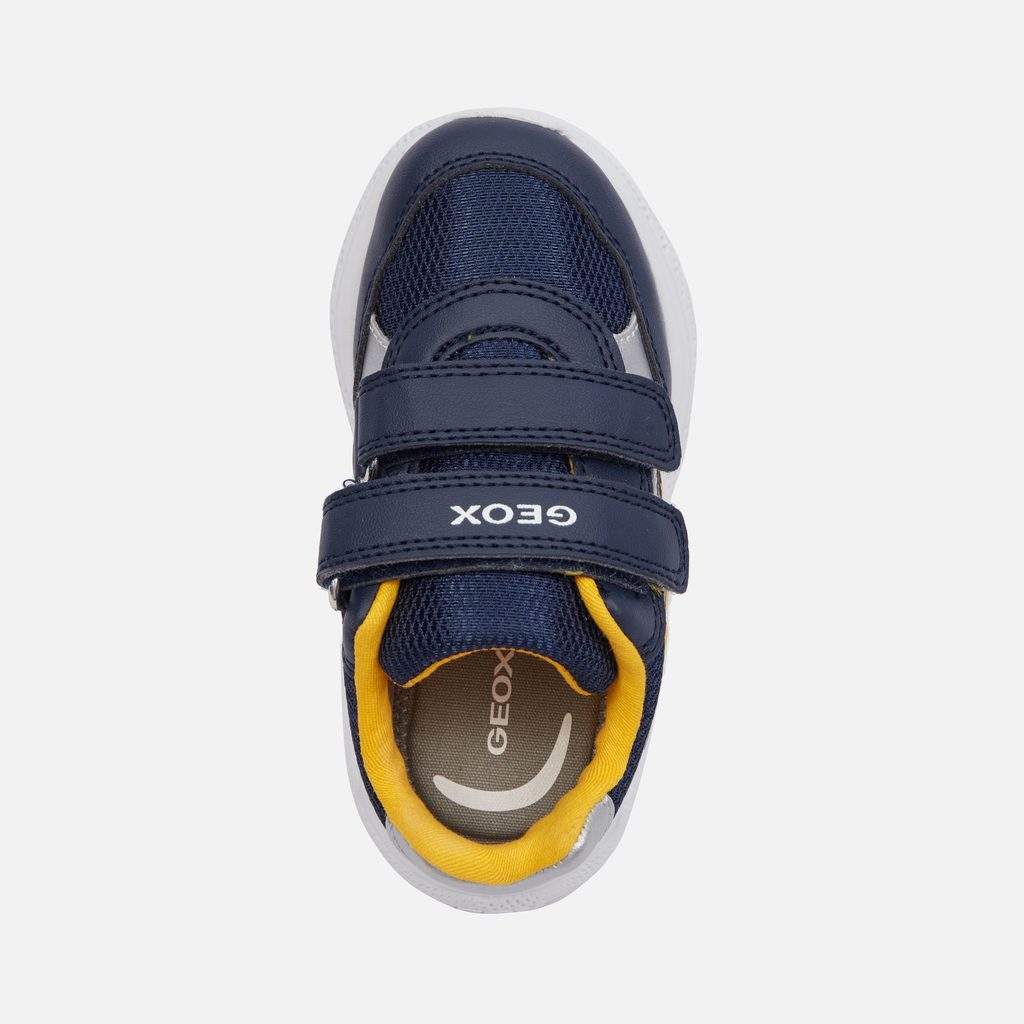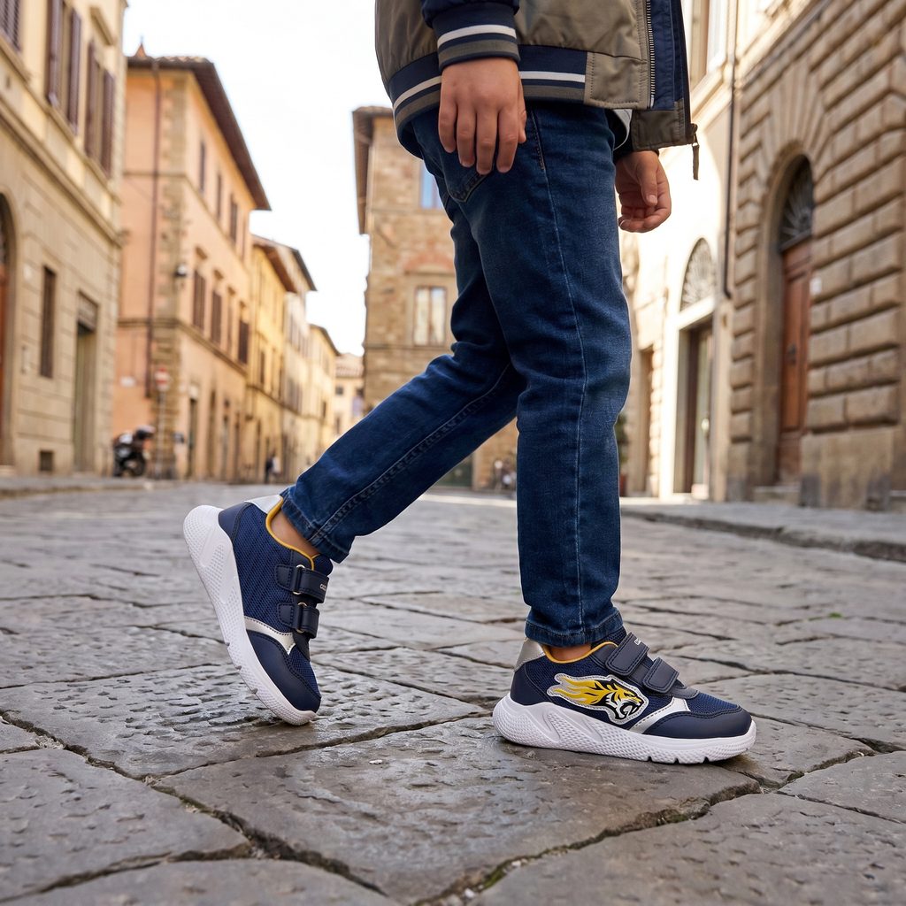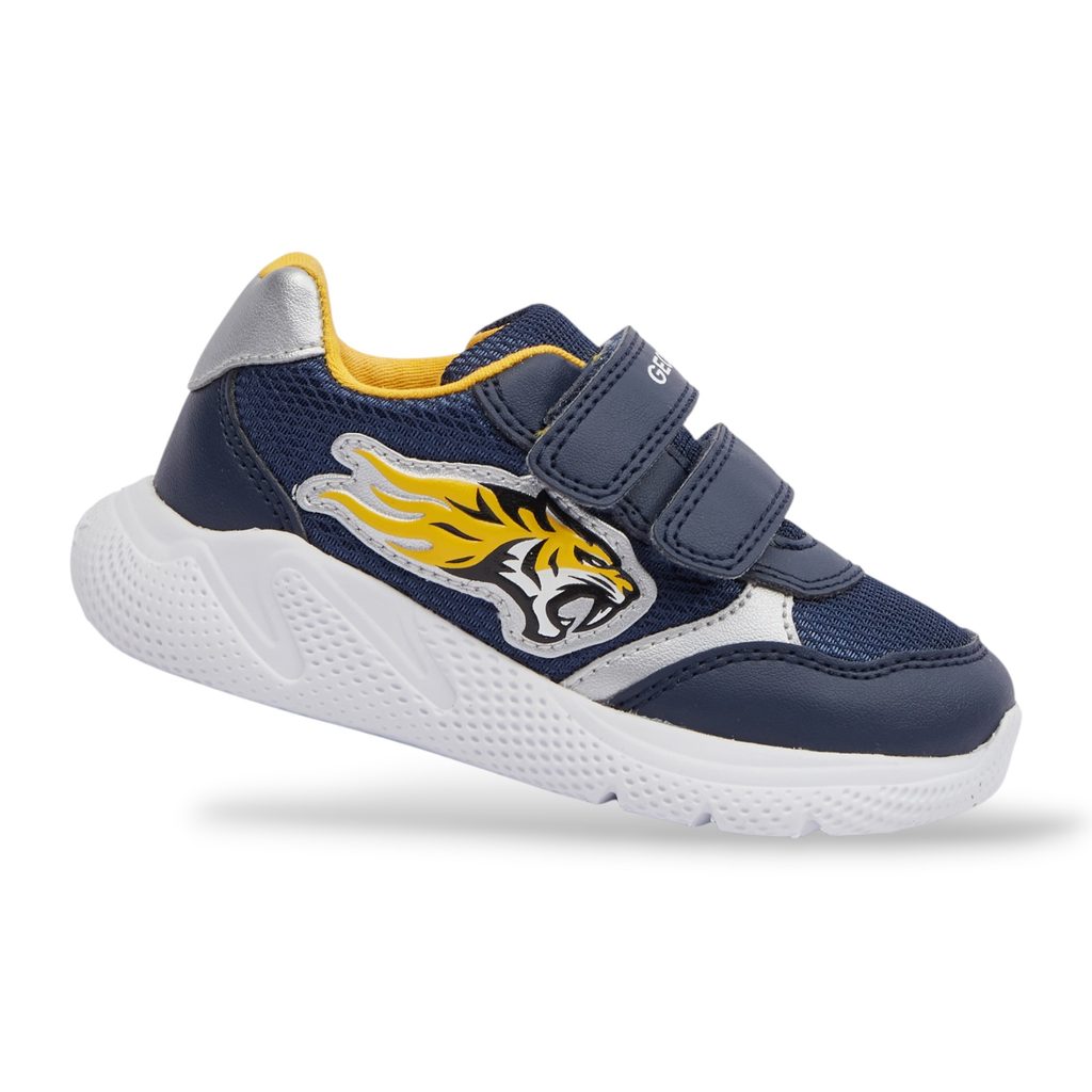 Dopřejte svému malému dobrodruhovi maximální pohodlí a styl v každé situaci. Tyto všestranné tenisky budou skvělým společníkem pro jeho každodenní dobrodružství. Tmavě modré chlapecké tenisky Geox Sprintye zaujmou stylovým designem s výrazným žlutým a černým motivem tygří hlavy na boku. Pohodlné zapínání je řešeno dvěma tmavě modrými pásky na suchý zip, vnitřní část boty je doplněna žlutým polstrováním pro větší komfort.