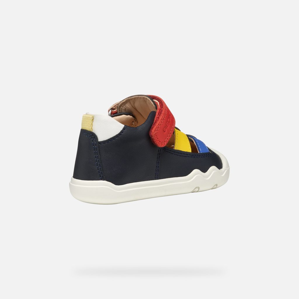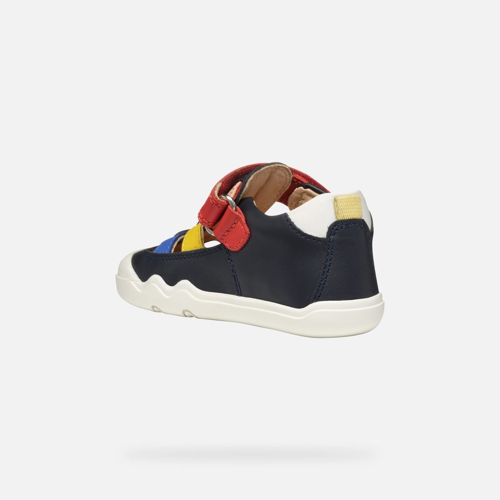 Tmavě modré chlapecké tenisky Geox Steppieup zaujmou svým sportovním designem a praktickým řešením. Výrazné barevné prvky v podobě žlutého a modrého pásku doplňuje červený pásek s logem GEOX na vrchní části. Bílá podrážka s vlnitým lemováním dodává botám moderní vzhled.