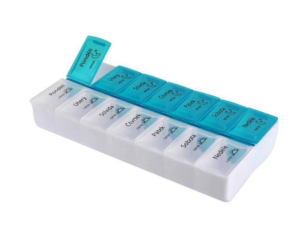 Sedmidenní dávkovač slouží ke spolehlivému a přehlednému uspořádání a dávkování léků i potravinových doplňků. Je značen symbolem zobrazujícím denní dobu (vycházející slunce) - Ráno / (měsíc) - Večer. Části dne jsou barevně odlišené pro lepší přehlednost. Každá část dne se otevírá samostatně. Materiál - plast.
