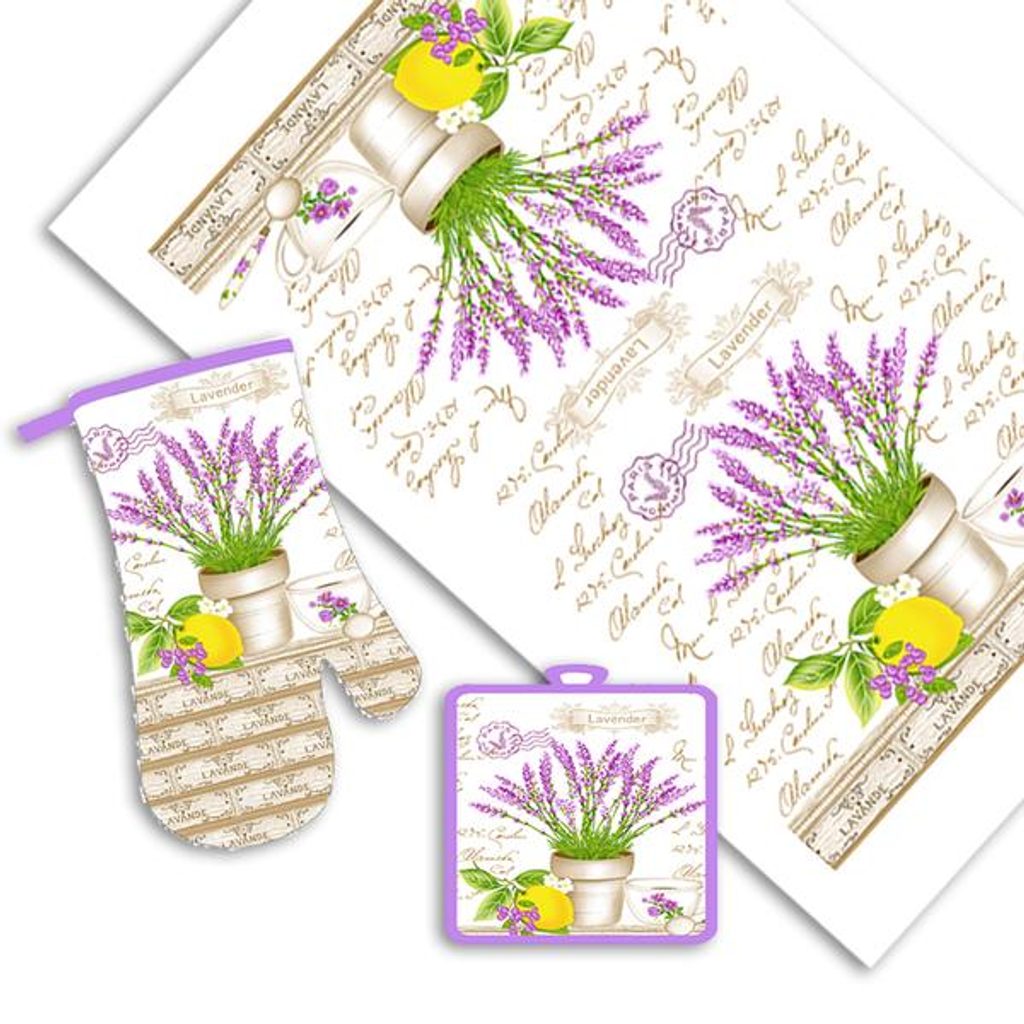 Kuchyňský set - utěrka, chňapka a rukavice s oblíbeným dekorem levandule zapadne do každé kuchyně. Tito tři pomocníci jsou v kuchyni nezbytní pro každodenní vaření, všechny mají praktická poutka na…