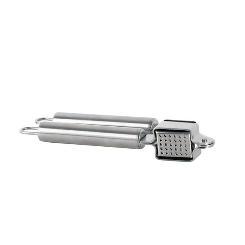 Celonerezový lis na česnek s otvorem pro zavěšení na závěsnou tyč. Rozměry - 19,5 x 5,7 x 3,4 cm. Barva stříbrná.