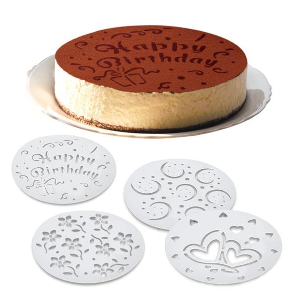 Sada různých 4 šablon určených ke zdobení dortů a kulatých moučníků. Materiál plast. Vhodné do myčky. Průměr 20 cm.