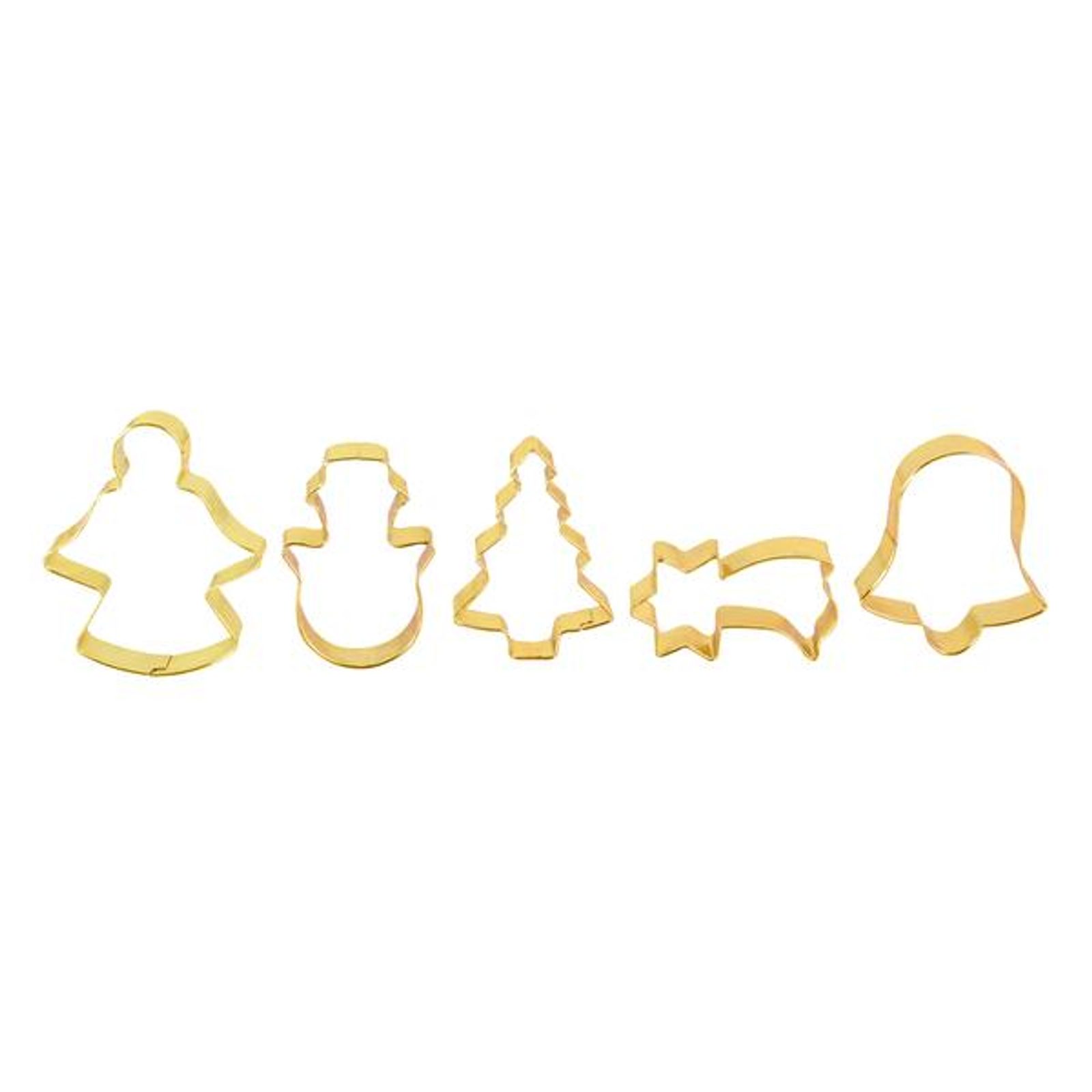 Vykrajovátka na cukroví jsou nepostradatelným pomocníkem v kuchyni při pečení cukroví. Vykrajovátka jsou "zlatá" a sadu tvoří 5 různých motivů. Motivy - anděl, zvonek, kometa, sněhulák a stromeček. Orientační velikost - 5 cm.