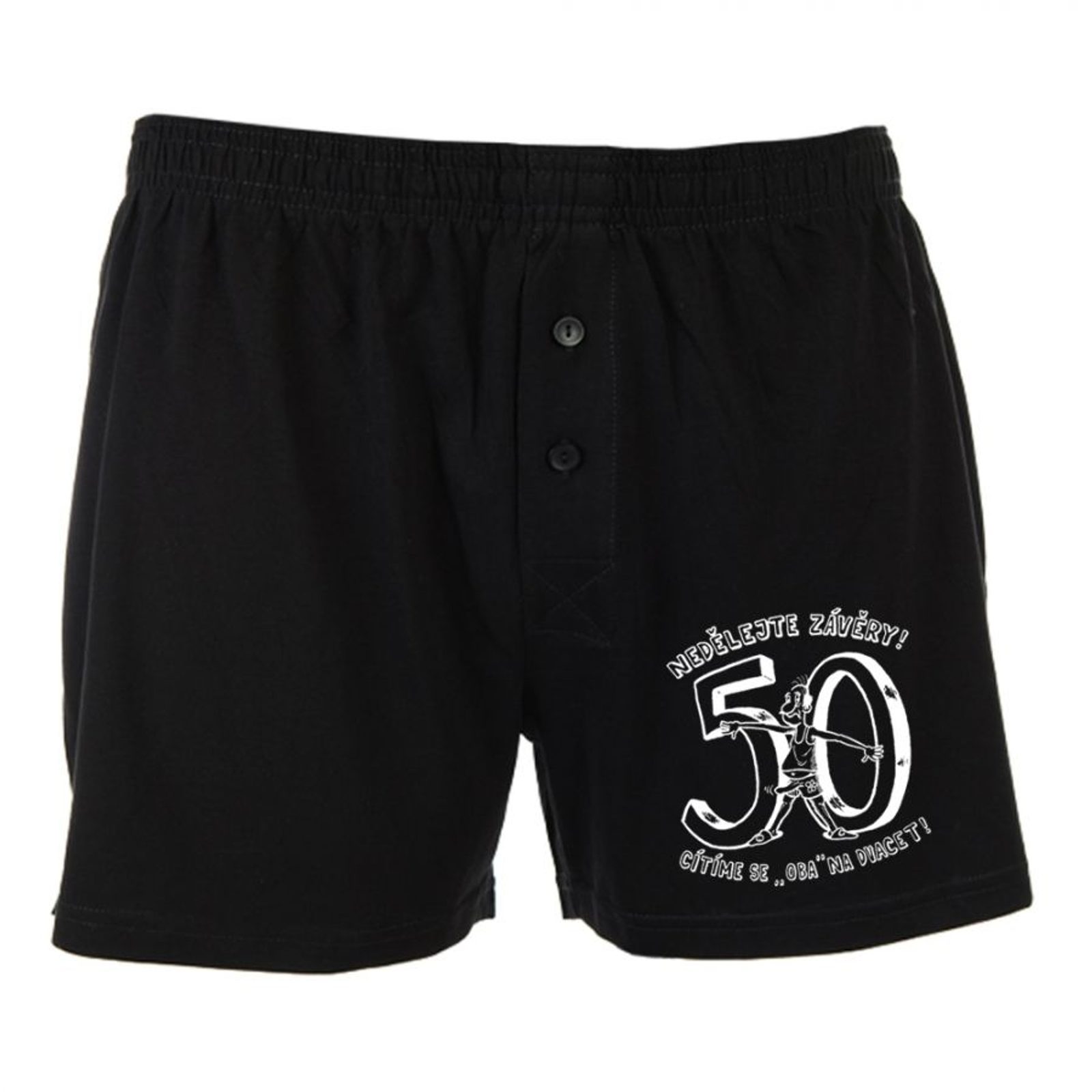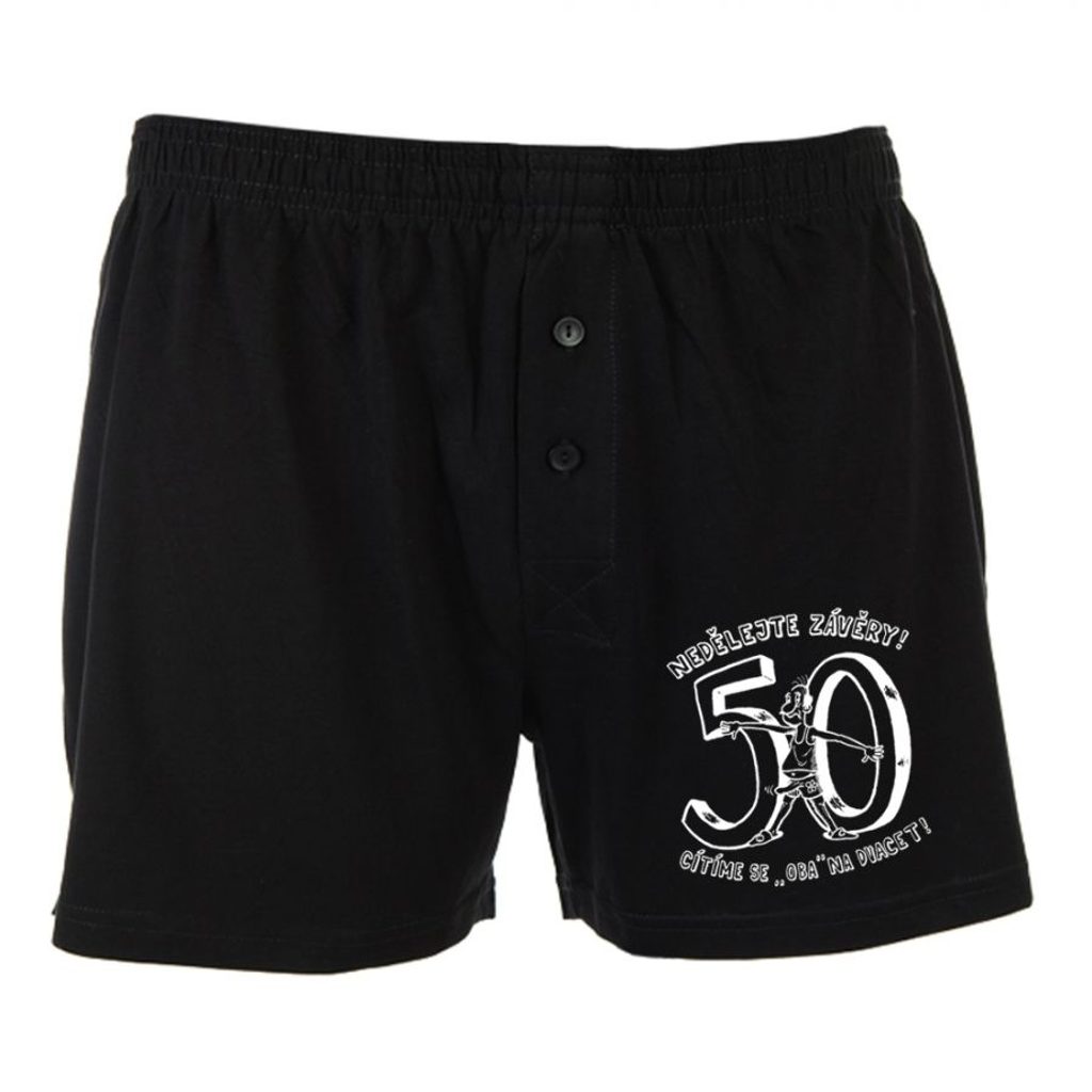 Originální vtipné trenýrky nápisem "Nedělejte závěry, cítíme se oba na dvacet" jsou ideálním dárkem k 50. narozeninám. Darujte praktický a vtipný dárek Vašemu muži, který slaví toto důležité životní výročí.