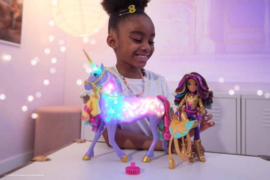 Objevte svůj osud v Jednorožčí akademii po boku Sofie a světelné duhové Polárky! Děti se mohou nechat inspirovat animovaným seriálem od NETFLIXu a bestsellerovou knižní sérií a přehrát si magický moment sblížení díky 28cm interaktivní panence Polárky a 24cm panence Sofie! Polárka reaguje na dotek duhovými světly, zvukovými efekty a písněmi z pořadu! Pohlaďte Polárce obličej, dotkněte se jejího rohu a zatáhněte za otěže, abyste viděli, jak reaguje! S tím, jak sílí vaše pouto, září Polárčiny magické bílé značky a roh čím dál tím jasněji, až se nakonec změní na duhu, jakmile si plně získáte její důvěru. Abyste spojení dovršili, podržte Polárčinu tvář, a ona okamžik oslaví znělkou ze seriálu! Jakmile si vytvoříte s Polárkou pouto, podržte její tvář pro přehrání hudby nebo se dotkněte jejího rohu pro aktivaci světelných efektů a mnoho dalšího! Při hraní posaďte Sofii na Polárku a jeďte za dobrodružstvím! Rozšiřte svůj svět Jednorožčí akademie o módní panenky a jednorožce (prodávají se zvlášť). Určeno pro děti, které mají rády jednorožce a koně, panenky a doplňky, hračky pro panenky, sběratelské předměty, plyšové hračky a další. Hračky s tematikou Jednorožčí akademie jsou perfektním dárkem pro dívky k narozeninám nebo jakékoli jiné příležitosti. Obsahuje 2 AA baterie, písně jsou v angličtině a instrumentální. Zažijte nevšední zábavu se Sofií a světelnou duhovou Polárkou!