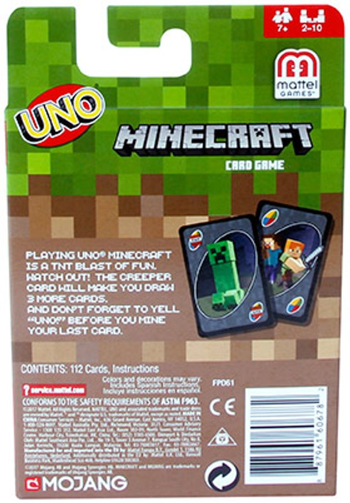 Stejně jako v tolik oblíbené karetní hře UNO™ i v UNO™ Minecraft je cílem hráčů se co nejrychleji zbavit všech karet. Tato verze přináší postavy a motivy z oblíbené hry Minecraft a její součástí je i speciální karta! UNO™ Minecraft navíc přináší nový typ akční karty. Jakmile vám v ruce zbývá poslední karta, nezapomeňte zakřičet „UNO“! Součástí setu je 112 karet a návod.