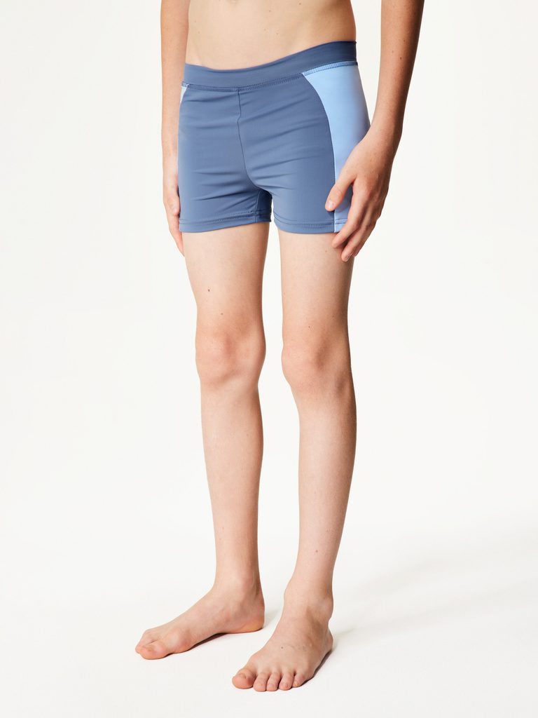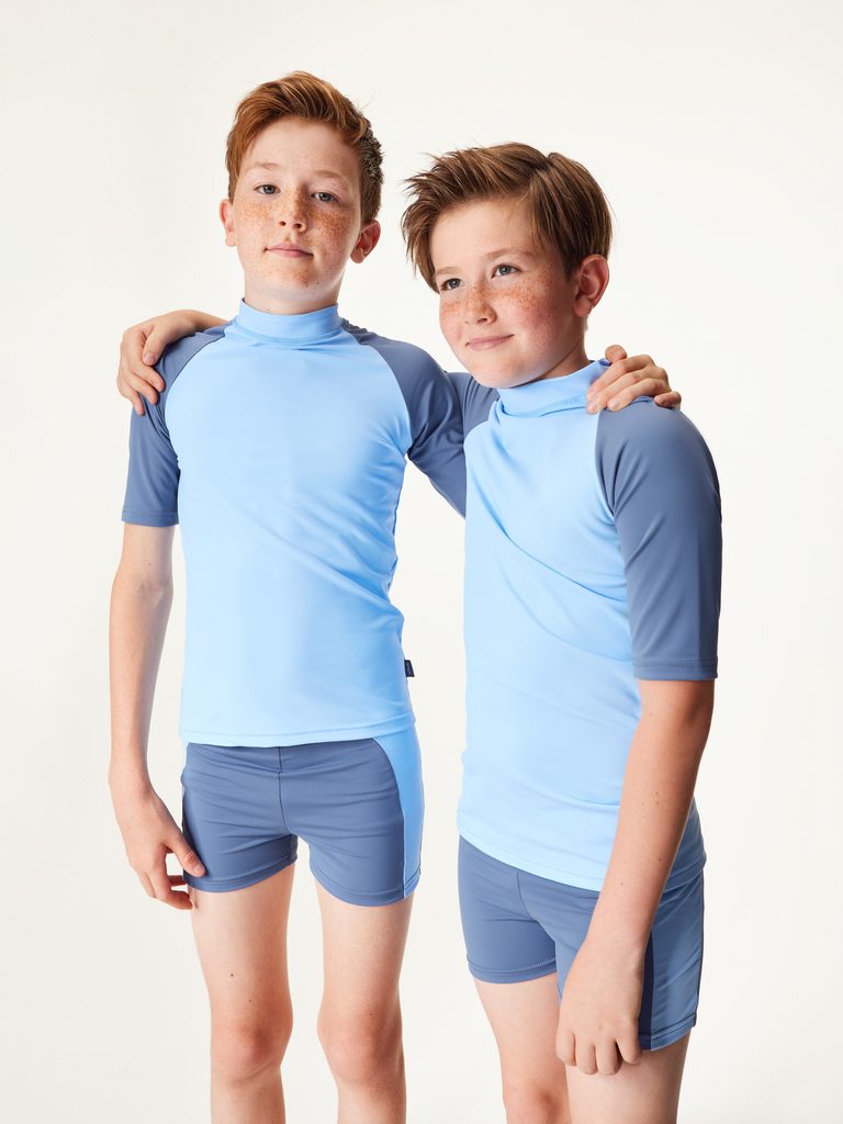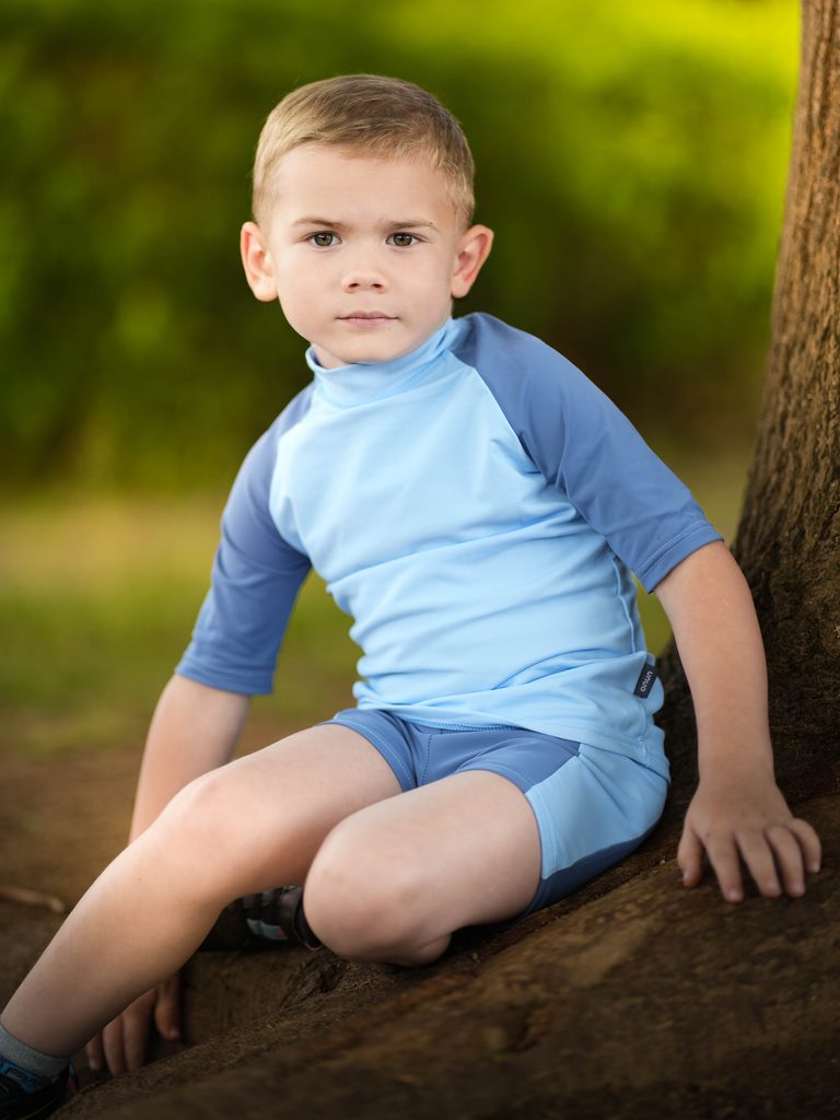 Kolekci vyrábíme z vysoce kvalitní italské plavkoviny s UV ochranou 50+. Recyklovaný polyamid s certifikací OEKO-TEX® zaručuje, že oblečení je šetrné k životnímu prostředí a zároveň bezpečné pro dětskou pokožku. Navíc je tento materiál rychleschnoucí, velmi příjemný na dotyk a zajišťuje maximální komfort během nošení. Díky speciální technologii při výrobě materiálu je UV ochrana trvalá a nevymývá se tak po několika pracích cyklech.