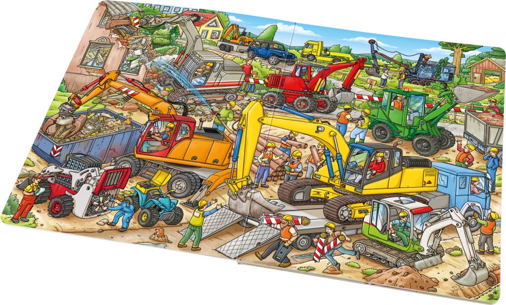 Tohle velkoformátové obrázkové leporelo ocení především fanoušci náklaďáků, bagrů, rypadel a dalších stojů, které pomáhají všude tam, kde se vzniká něco nového. Červený bagr s dvojitými pneumatikami, zelený kolový nakladač, oranžový minibagr, žluté pásové rypadlo… rozmanitá technika vykonává ty nejnáročnější práce. A pak je tu třeba spousty lidí, kteří umějí práci strojů naplánovat, a také těch, kdo je dokážou obsluhovat! Když se budete dobře dívat, objevíte některé stroje a hrdiny na každé stránce, a můžete tak sledovat jejich příběhy.