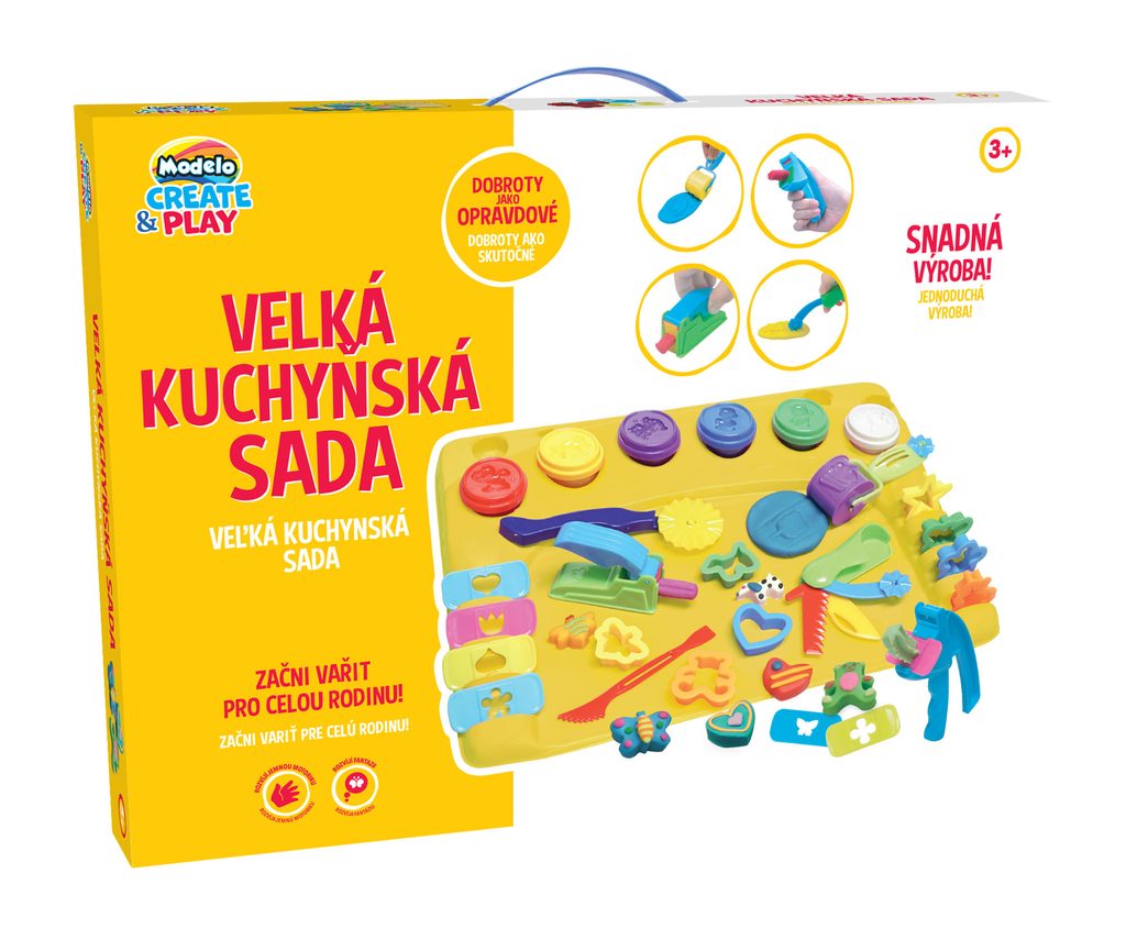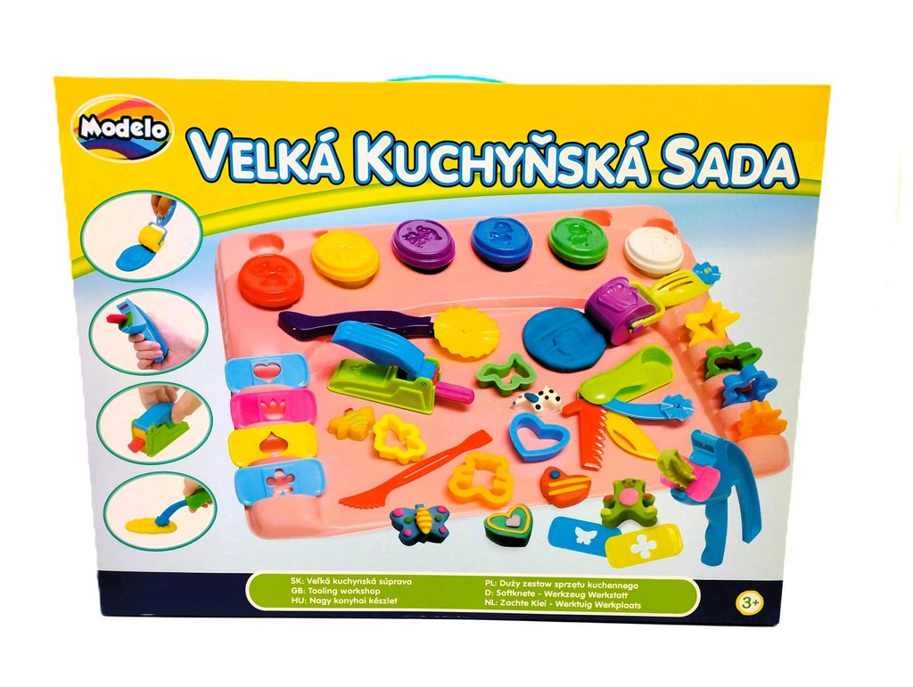 Báječná velká kuchyňská sada s 12-ti kelímky různě barevné modelíny, válečkem a velkým množstvím tvořítek pro malé výtvarníky, aby si mohli vytvořit krásné barevné výtvory - např. autíčko, domeček se zahrádkou, letadlo nebo cokoliv jiného podle vlastní fantazie.