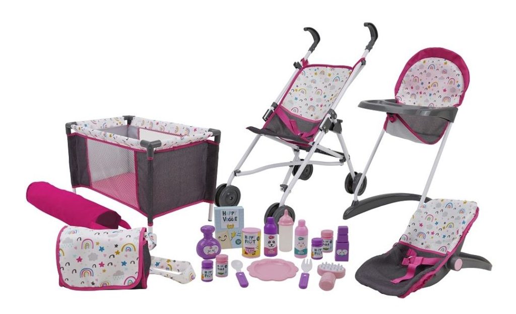 Velký herní set potřeb pro panenky vhodné do cca. 46 cm. Sada obsahuje 21 kusů. Pro děti od 3 let.