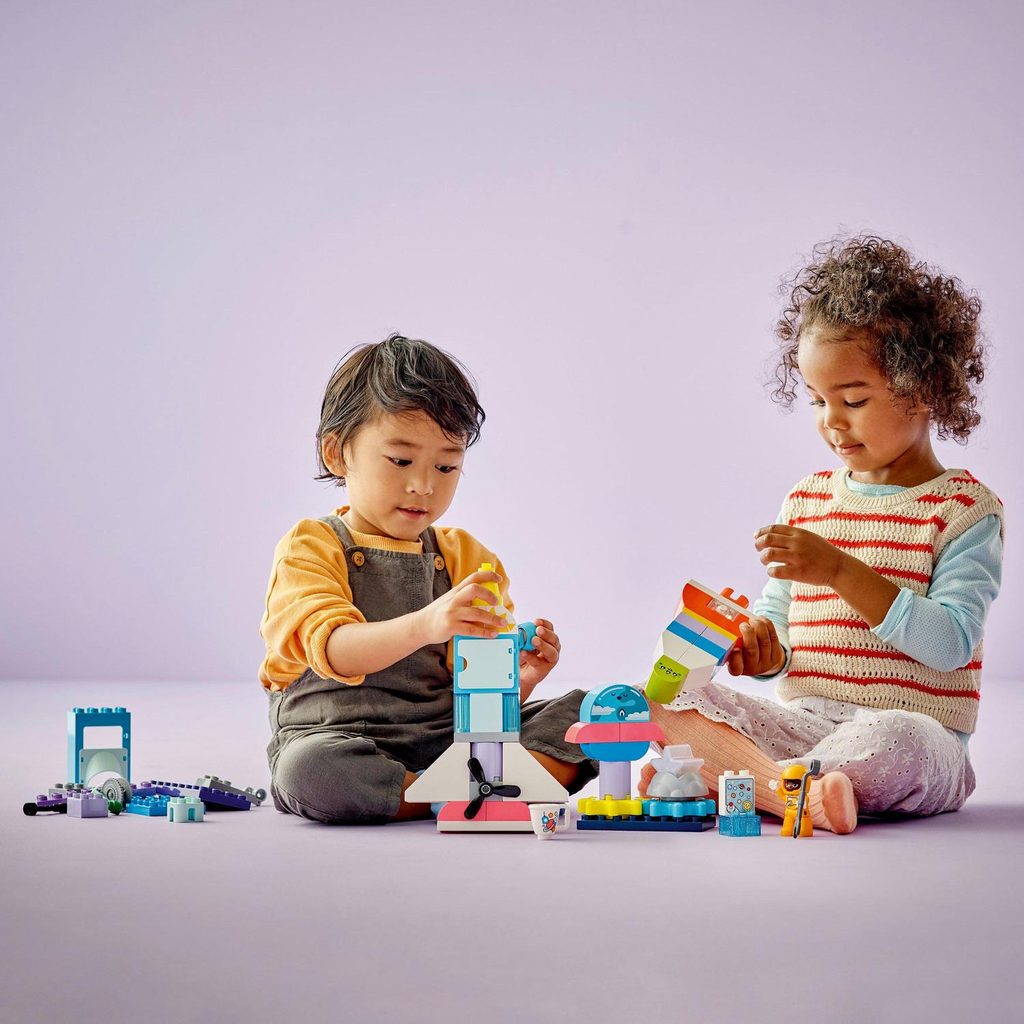 Tato vesmírná hračka je plná zábavných doplňků, které podněcují kreativní hraní. Děti prozkoumají nové obzory a prožijí galaktická dobrodružství se 2 figurkami LEGO® DUPLO® astronautů – spřátelí se s mimozemšťanem nebo se třeba vydají opravit raketoplán pomocí hasáku.
