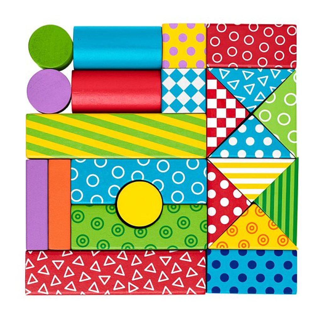 36ti dřevěných kostiček umístěných v dřevěném vozíku. 12 z nich je ze dvou stran barevná a je plasticky provedena tak, aby mohla sloužit po namočení do tiskařského polštářku i jako razítko. Ostatní kostky jsou v barevném provedení s potiskem. | Věk: 3+ | Rozměr: 27 x 24 x 6 cm