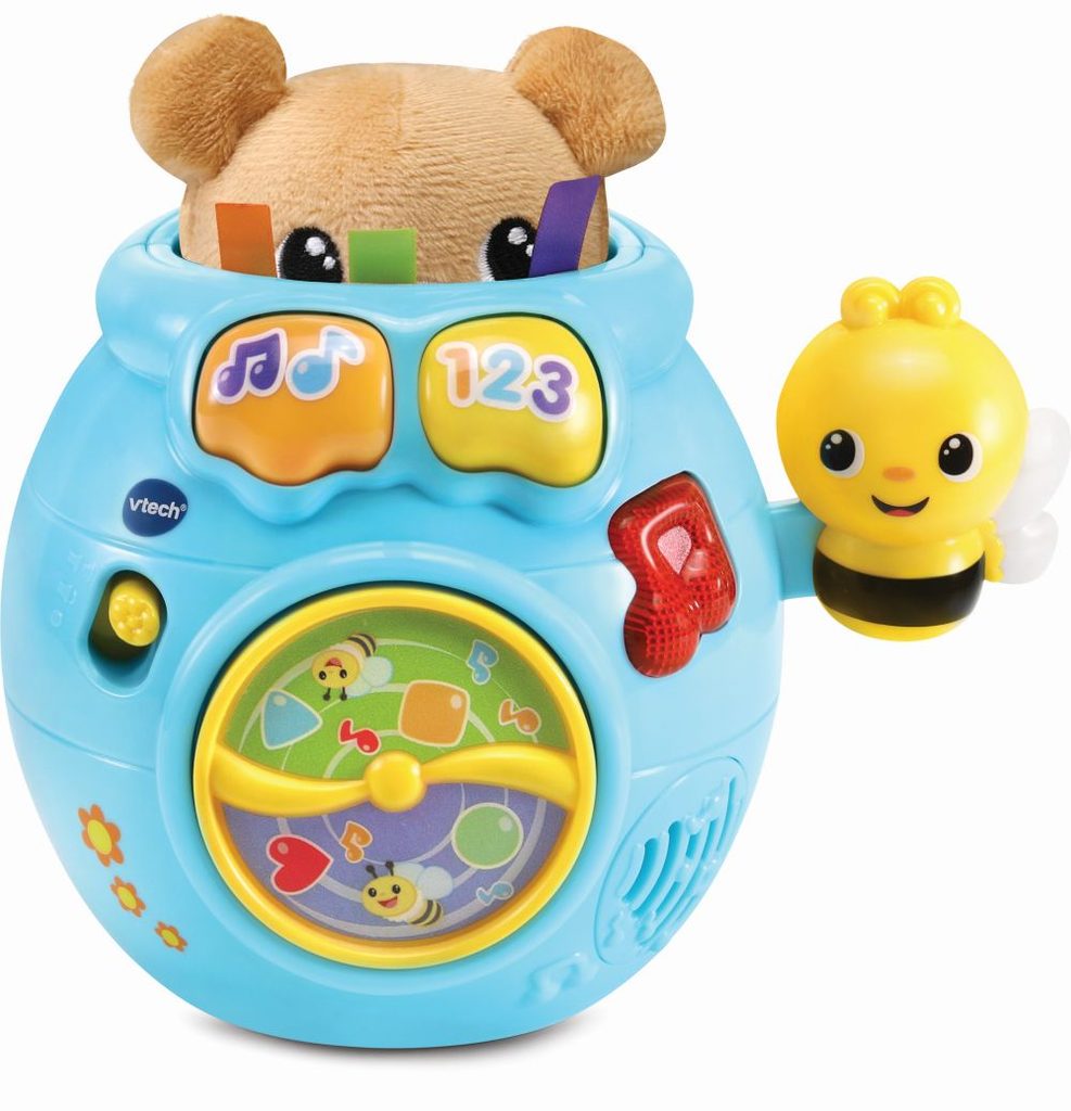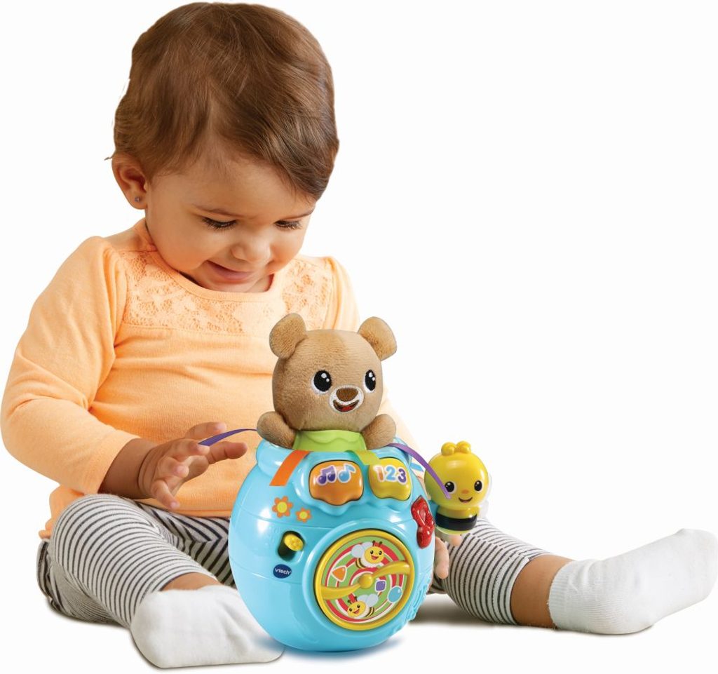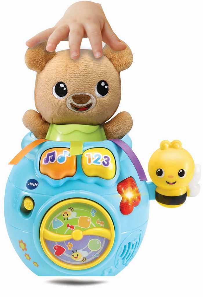 Vtech Medvídku, schovej se! je legendární hudební a vzdělávací hračka pro děti již od 6 měsíců. Roztomilými frázemi interaktivně komunikuje s dítětem. Lehkým zatlačením medvídka do hrnce se medvídek schová. Následným stiskem tlačítka pak medvídek „vyskočí“ z hrnce ven. Vše je doprovázeno zábavnými frázemi, písněmi a melodiemi. Pohyblivá včelka na boku hrnce s medem dokáže také roztočit vrtulku na přední části hrnce.