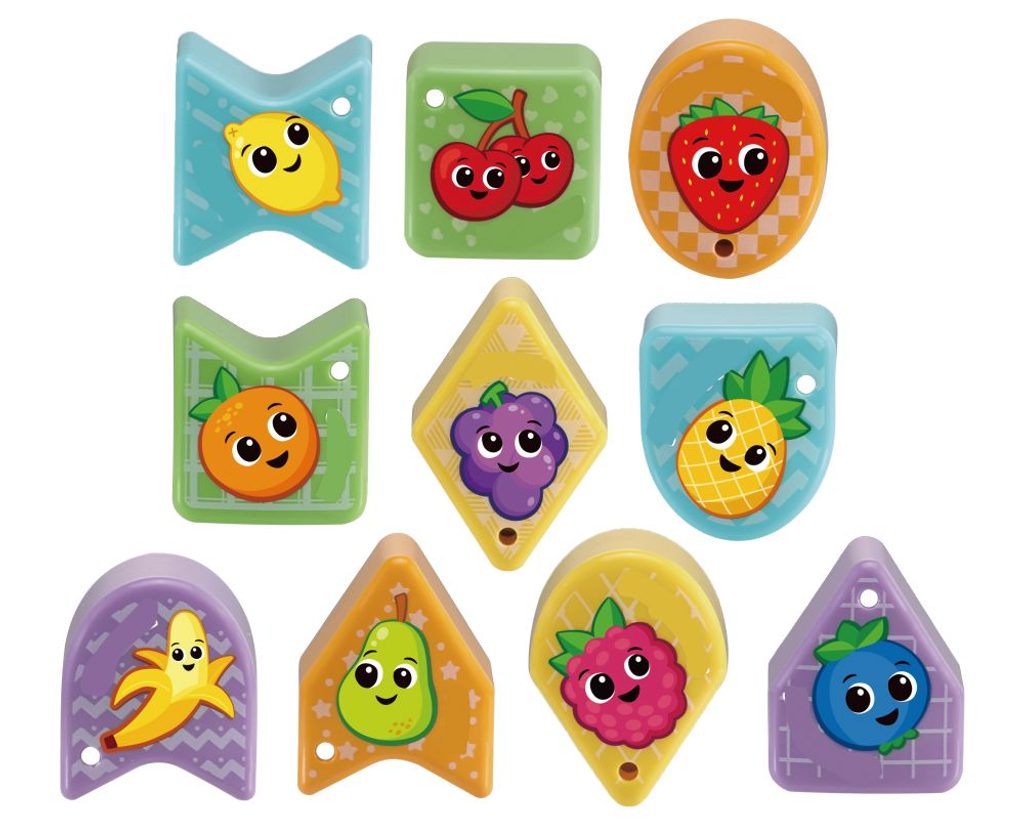 Stiskem stopky se vytváří další, nové tvary. Vkládání tvarů do otvorů rozvíjí koordinaci ruka-oko, prostorové vnímání, logické myšlení, objevování a jemné motorické dovednosti.