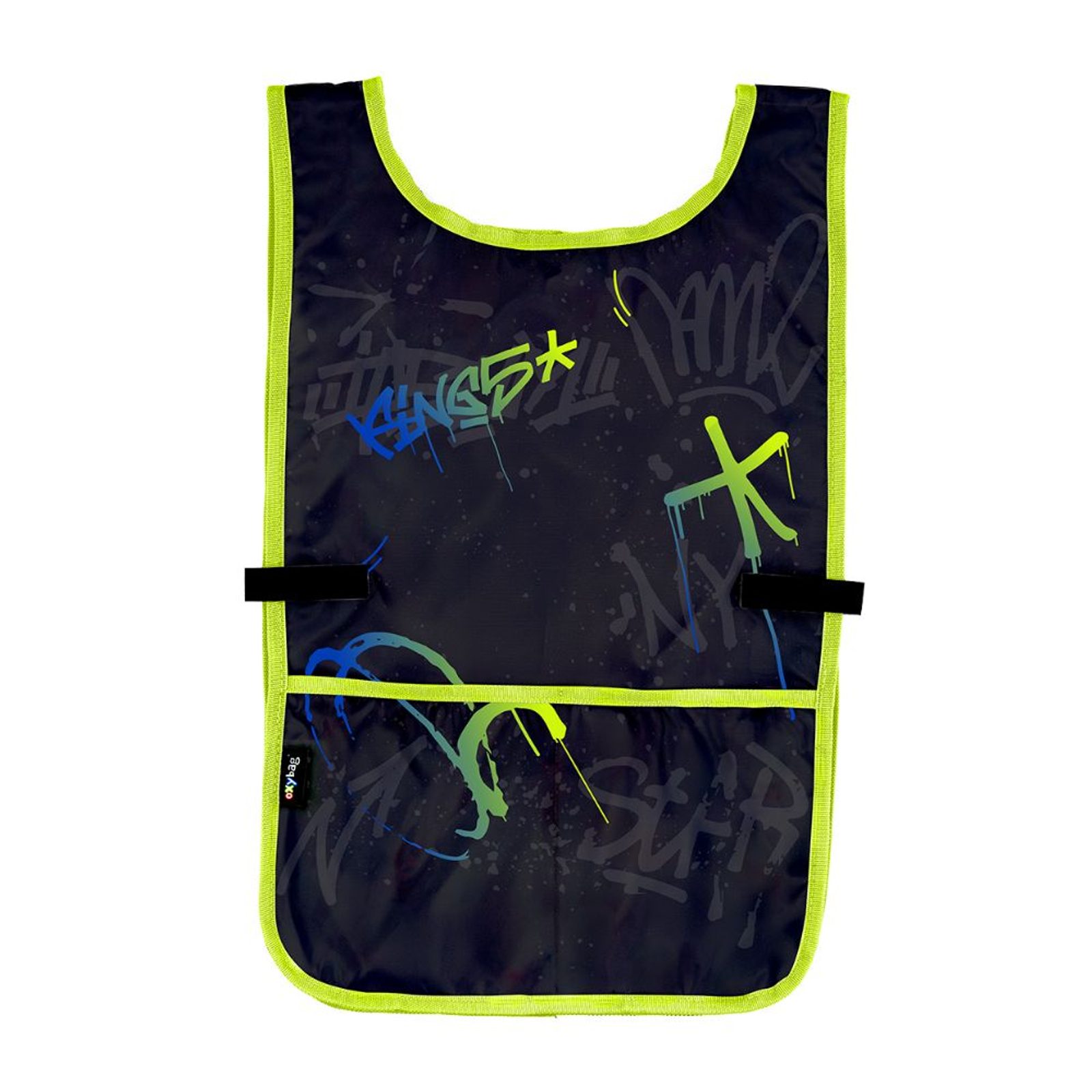Zástěra pončo do výtvarné výchovy či na jiné tvořící aktivity. Oblékání přes hlavu, po stranách zapínání na druk. Vpředu jedna prostorná kapsa. Materiál 100% polyester.