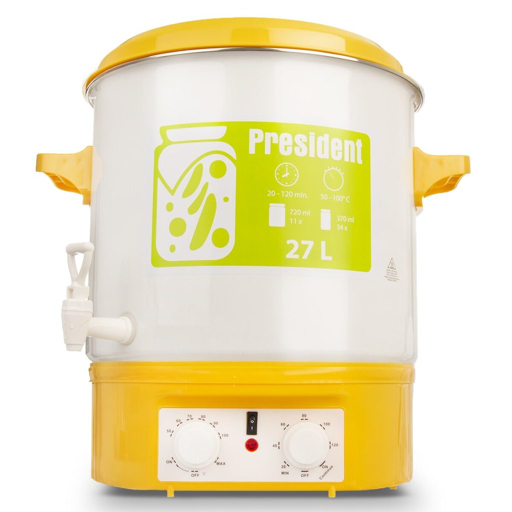 Univerzální zavařovací hrnec - objem 27 l, hygienický smaltovaný - snadno čistitelný. Pro zavařování např. 11 sklenic 0,75 l nebo 34 sklenic 0,37 l. Plynule nastavitelný termostat od 50 - 100 °C, plynule nastavitelný časovač od 20 - 120 minut. Plastové víko, skrytý topný článek, vestavěný výtokový kohout v boku hrnce. Ochrana proti vyvaření i přehřátí, světelná signalizace zapnutí, tepelně izolované rukojeti, součástí zavařovací rošt. Lze použít i pro ohřev a stáčení čaje, svařeného vína a jiných horkých nápojů. Příkon 1800 W. Napájení 220 - 240 V. Rozměry: v. 29 cm, pr. 37 cm (včetně okraje), š. včetně držadel 46 cm.