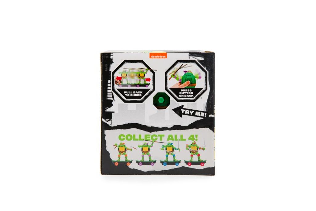 The Teenage Mutant Ninja Turtles jsou cca 13 cm velké želvy na skatech připraveny na boj. Mají typický design oblíbených želv Ninja, které drží svoji ikonickou zbraň. Zatáhněte želvu Ninja dozadu, pusťte ji a sledujte, jak jezdí! Stisknutím tlačítka na krunýři spustíte bojový režim! Nasbírejte všechny 4 postavy! Vhodné pro děti od 3 let.