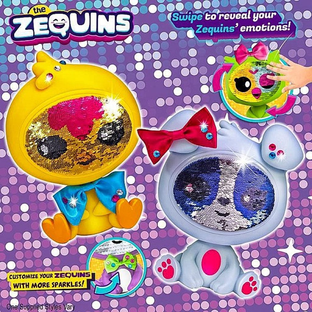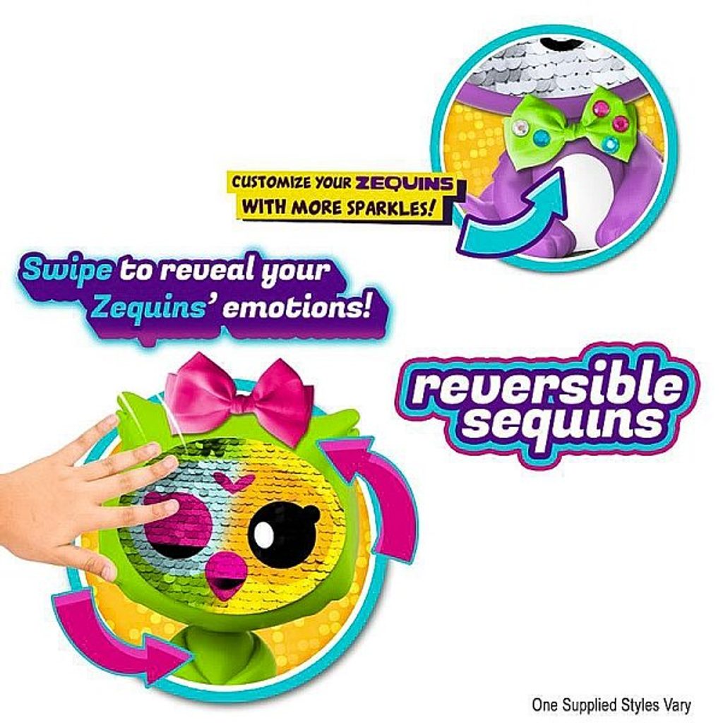 Chceš vědět jako má tvoje Zequins dnes náladu? Stačí projet rukou na flitrovém obličeji a vše je jasné! Když budeš chtít může se mračit nebo byt zvědavá! Podívej se jak se nálada tvoje Zequins mění pouhým pohybem ruky. Přesuň třpytky na obličeji a Zequins je úplně jiná! Můžeš měnit kdy chceš, celou nebo jenom část - je to jen na tobě. Ukaž všem jak se dnes ty a Zequins máte. Ukaž své emoce prostřednictvím Zequins, hraj si s kamarádky. 6 druhu.